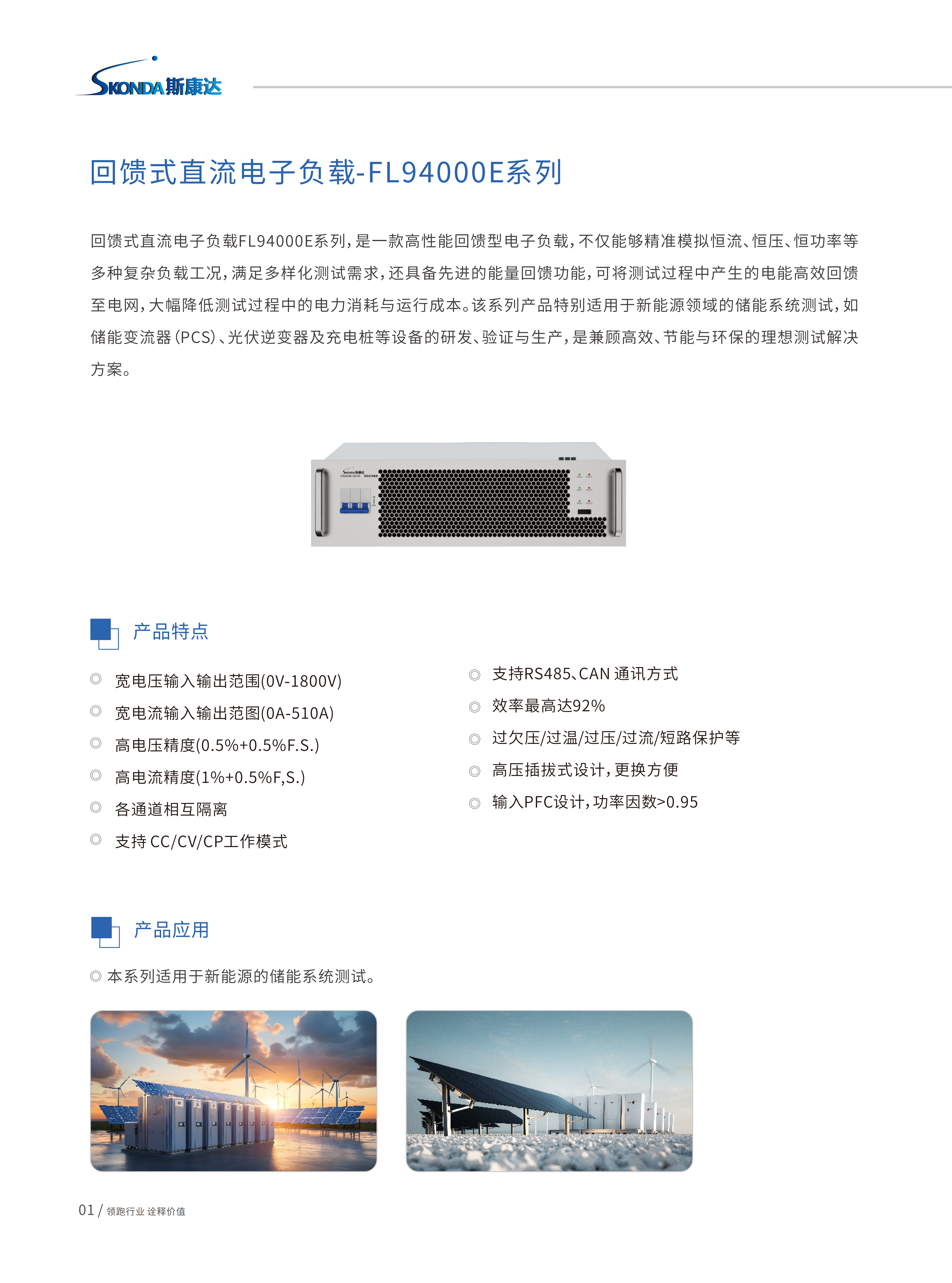 回馈式直流电⼦负载FL94000E系列,是⼀款⾼性能回馈型电⼦负载,不仅能够精准模拟恒流、恒压、恒功率等 多种复杂负载⼯况,满⾜多样化测试需求,还具备先进的能量回馈功能,可将测试过程中产⽣的电能⾼效回馈 ⾄电⽹,⼤幅降低测试过程中的电⼒消耗与运⾏成本。该系列产品特别适⽤于新能源领域的储能系统测试,如 储能变流器(PCS)、光伏逆变器及充电桩等设备的研发、验证与⽣产,是兼顾⾼效、节能与环保的理想测试解决 ⽅案。