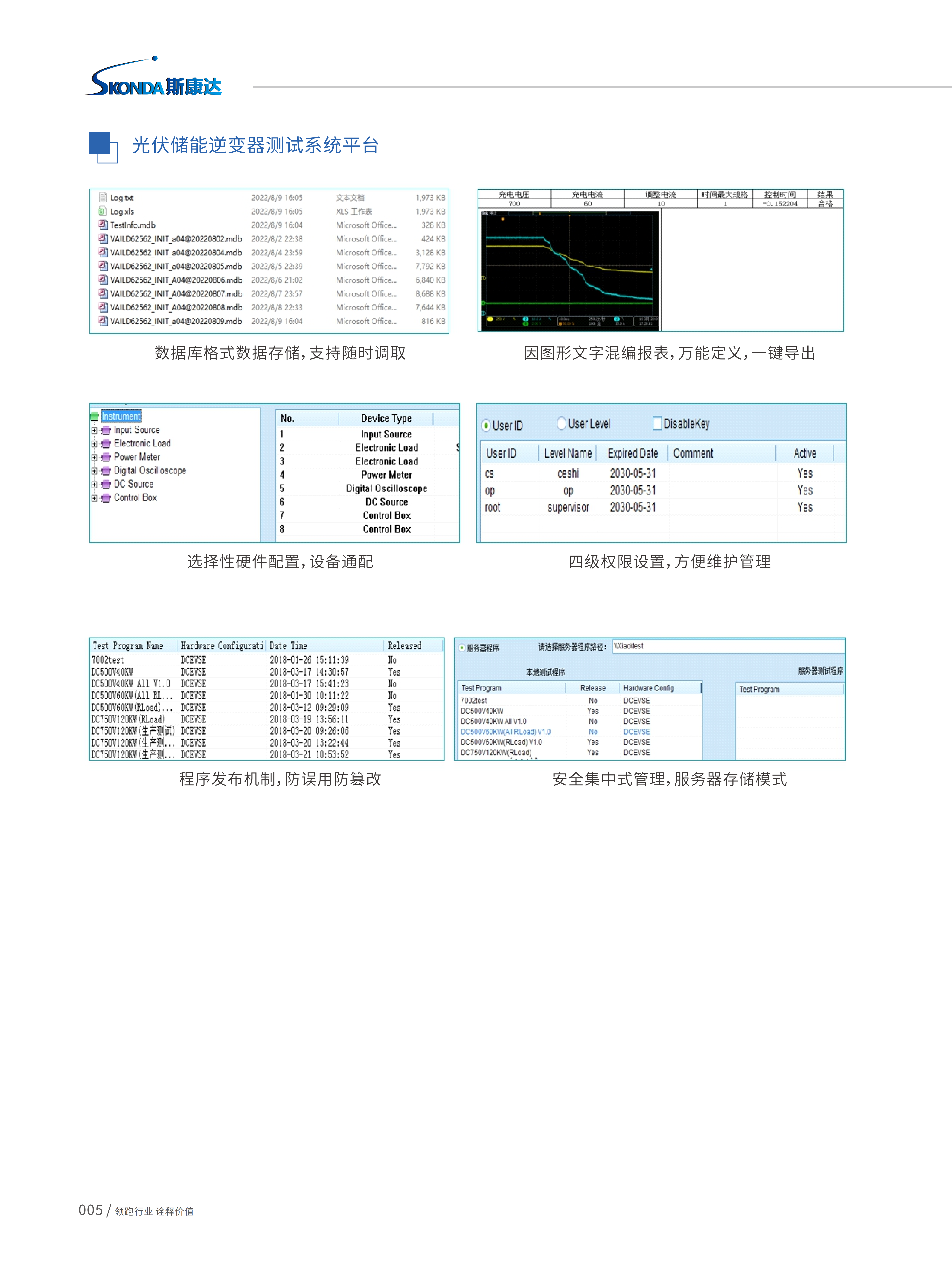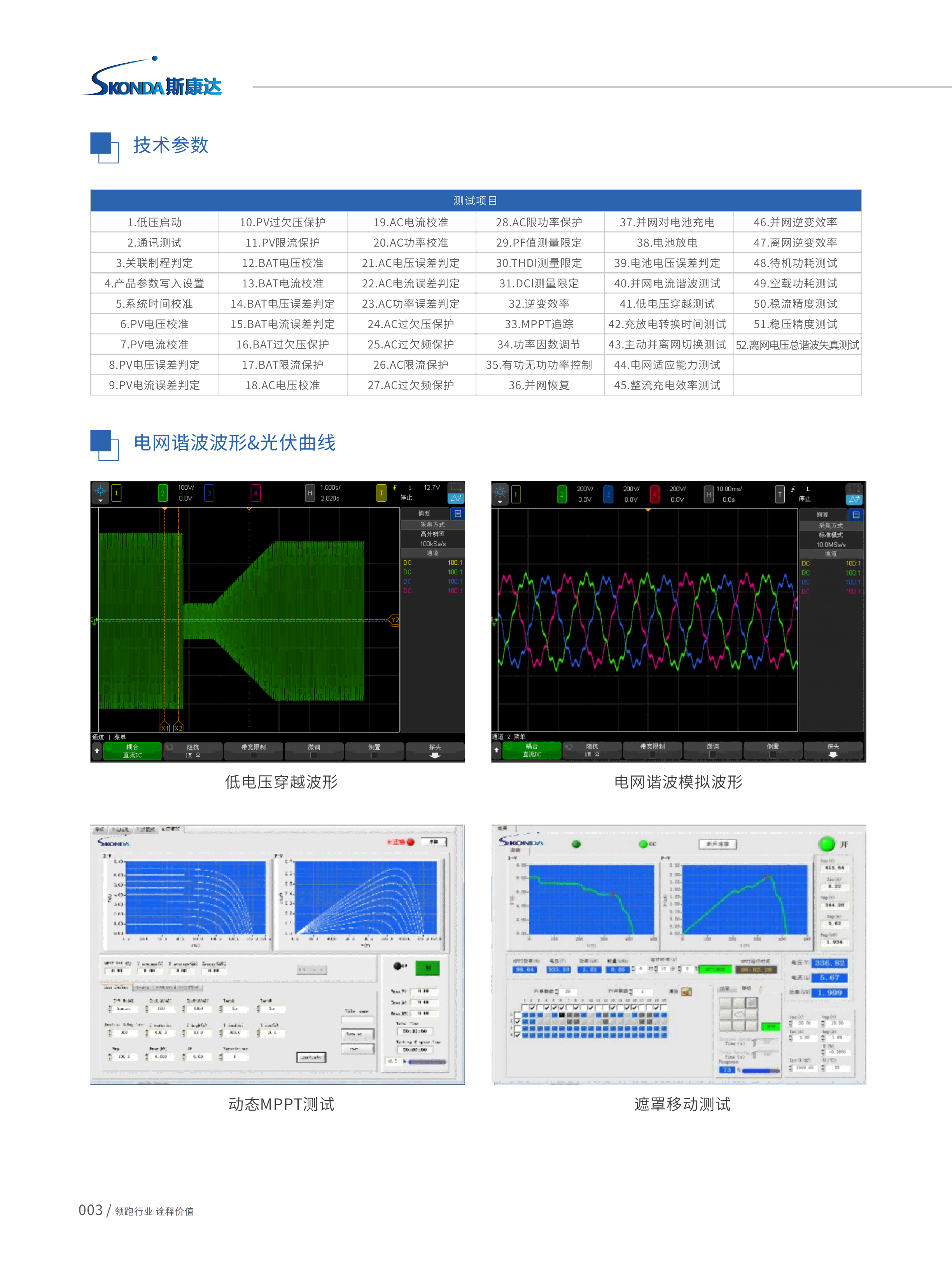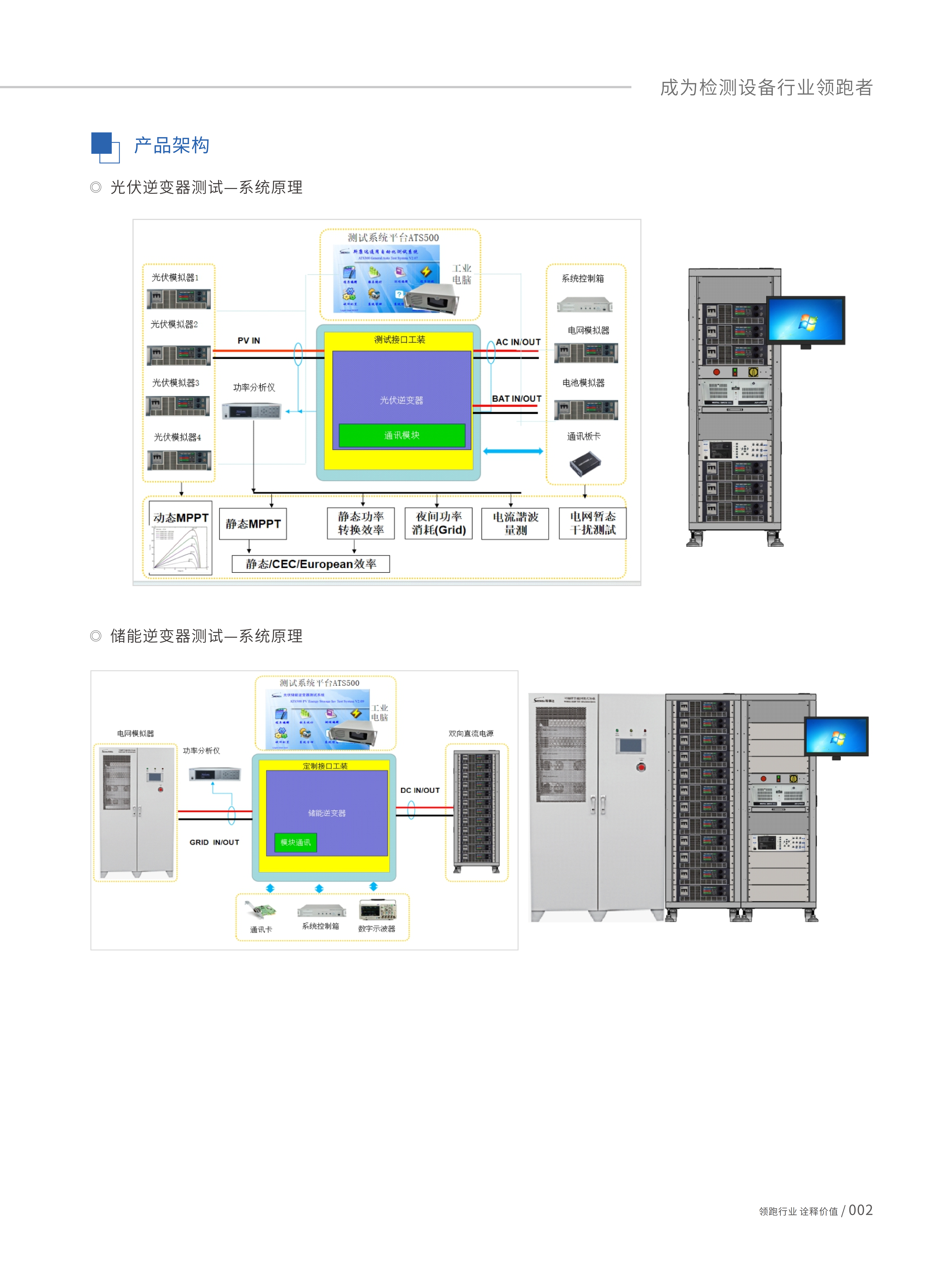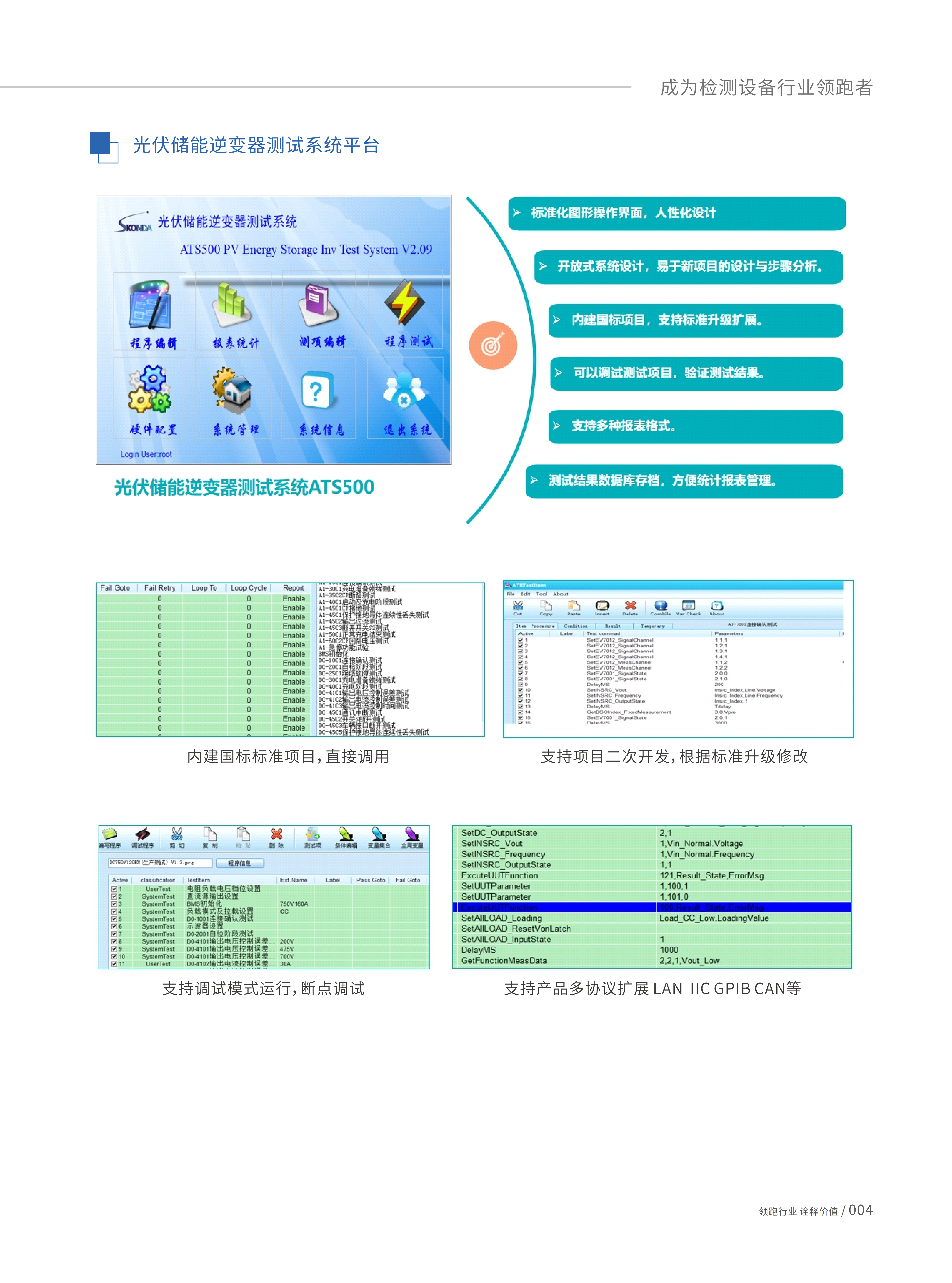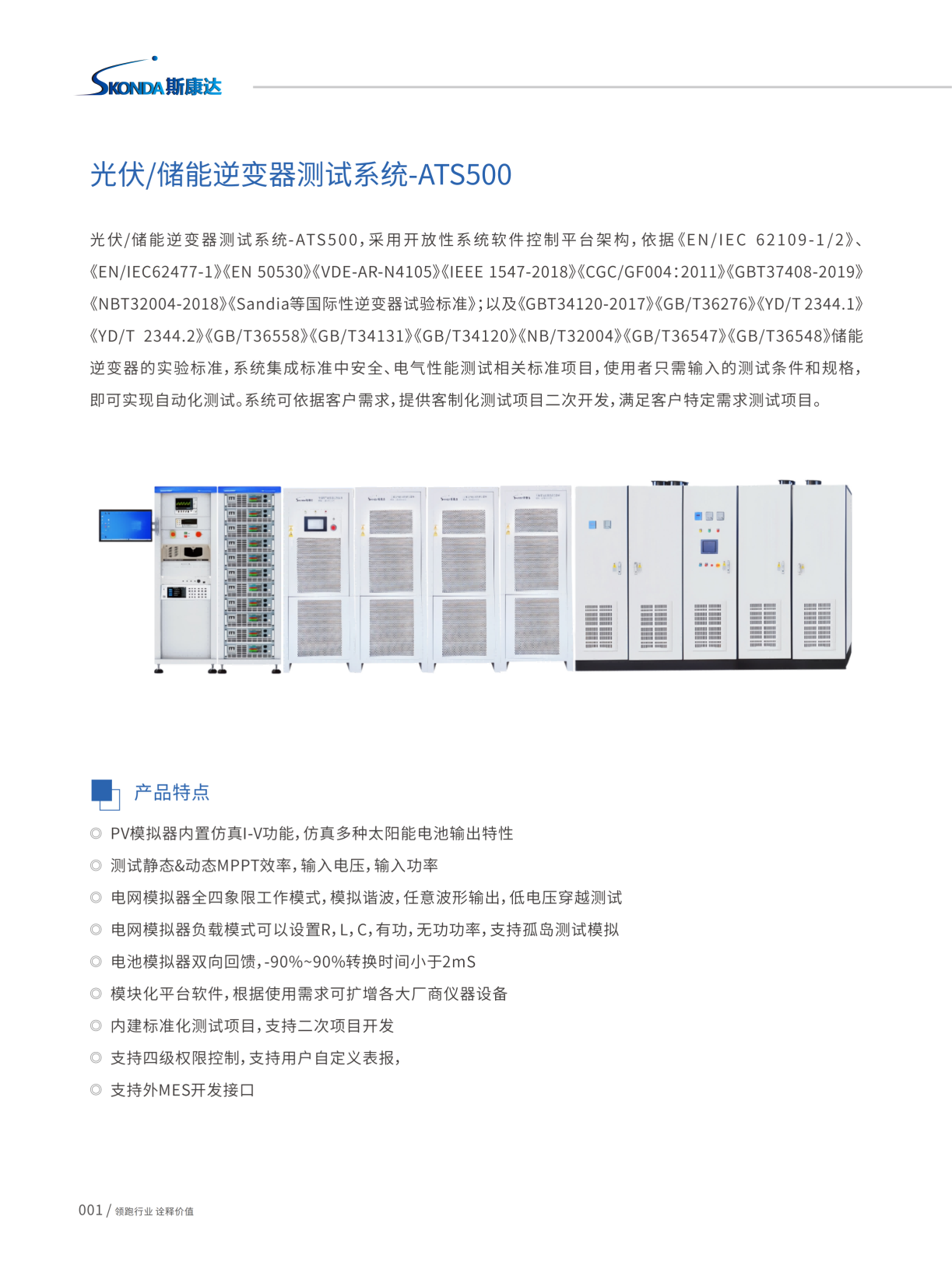 光伏/储能逆变器测试系统-ATS500,采用开放性系统软件控制平台架构,依据《EN/IEC 62109-1 /2》、《EN/IEC62477-1》《EN50530》《VDE-AR-N4105》《IEEE1547-2018》《CGC/GF004:2011》《GBT37408-2019》《NBT32004-2018》《Sandia等国际性逆变器试验标准》;以及《GBT34120-2017》《GB/T36276》《YD/T2344.1》《YD/T 2344.2》《GB/T36558》《GB/T34131》《GB/T34120》《NB/T32004》《GB/T36547》《GB/T36548》储能逆变器的实验标准,系统集成标准中安全、电气性能测试相关标准项目,使用者只需输入的测试条件和规格,即可实现自动化测试。系统可依据客户需求,提供客制化测试项目二次开发,满足客户特定需求测试项目。
