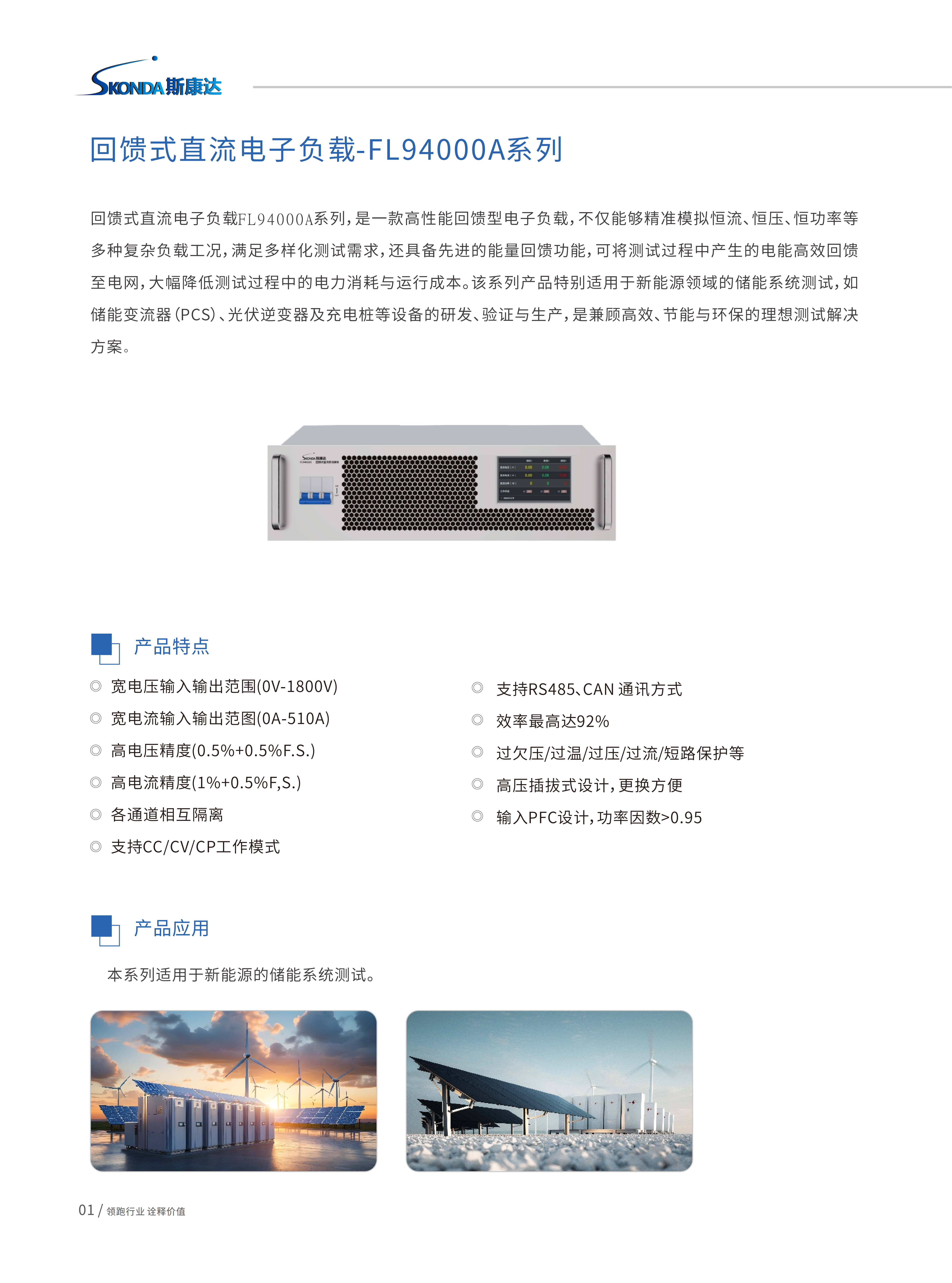 回馈式直流电⼦负载FL94000A系列,是⼀款⾼性能回馈型电⼦负载,不仅能够精准模拟恒流、恒压、恒功率等 多种复杂负载⼯况,满⾜多样化测试需求,还具备先进的能量回馈功能,可将测试过程中产⽣的电能⾼效回馈 ⾄电⽹,⼤幅降低测试过程中的电⼒消耗与运⾏成本。该系列产品特别适⽤于新能源领域的储能系统测试,如 储能变流器(PCS)、光伏逆变器及充电桩等设备的研发、验证与⽣产,是兼顾⾼效、节能与环保的理想测试解决⽅案。