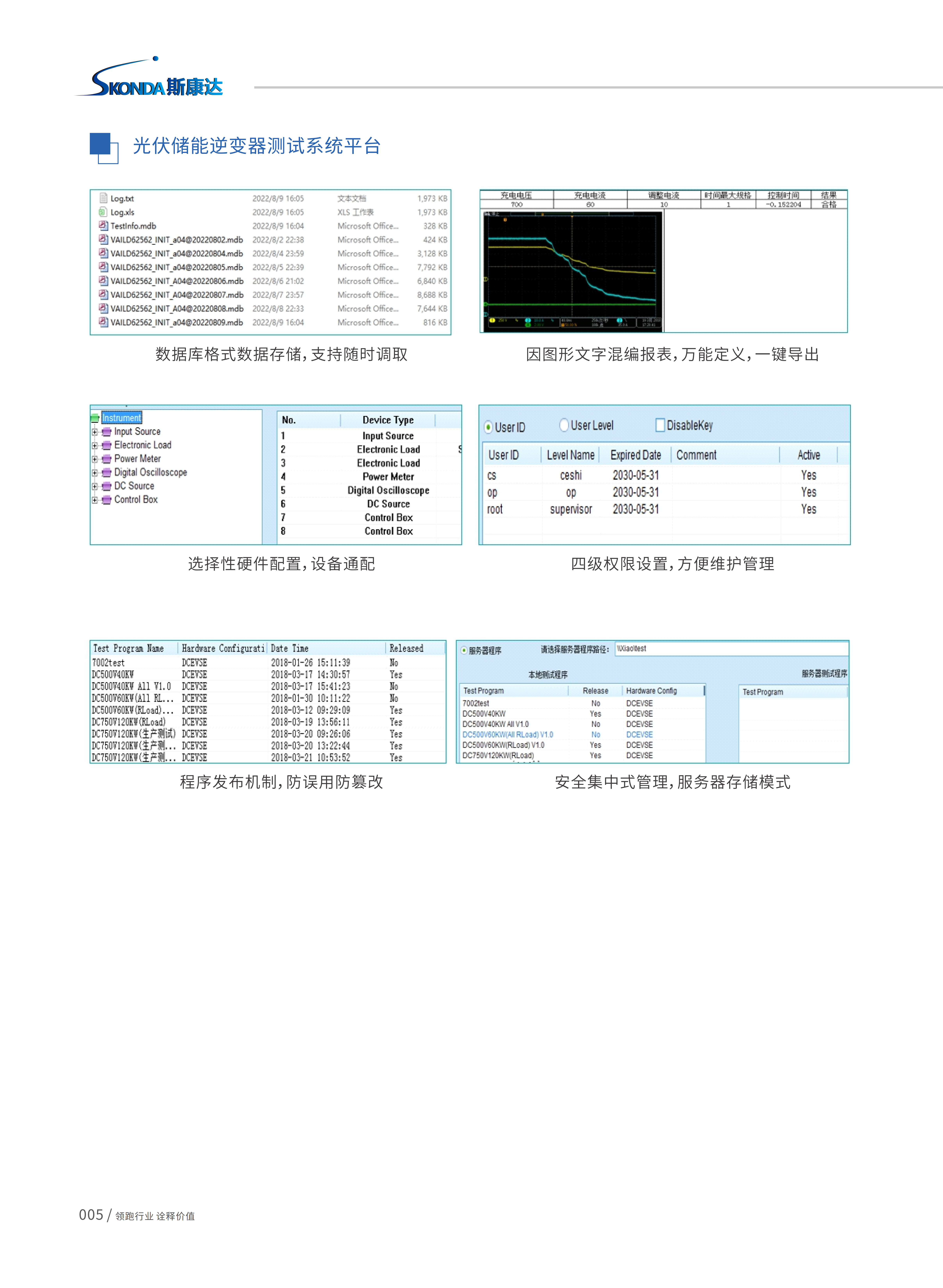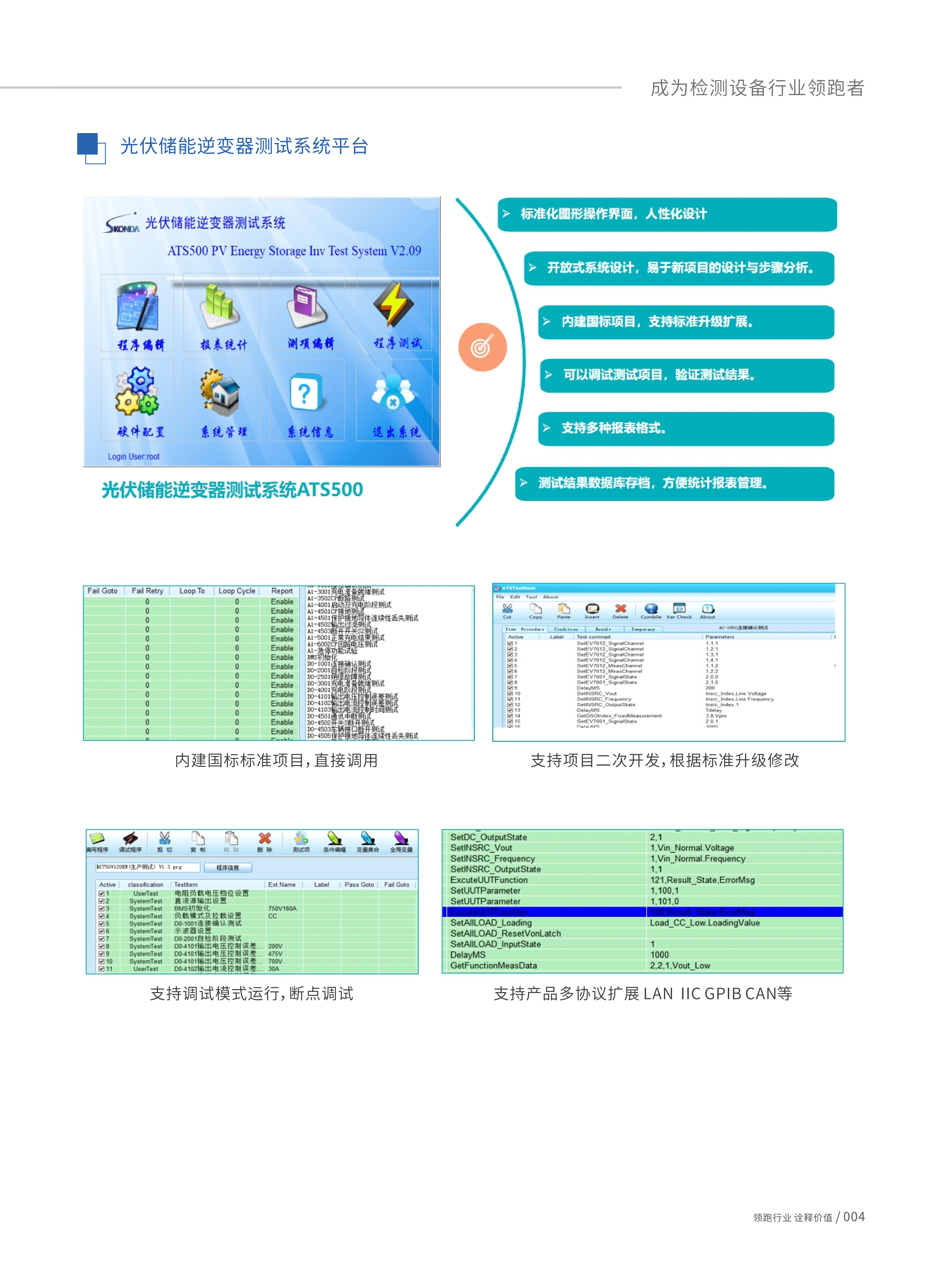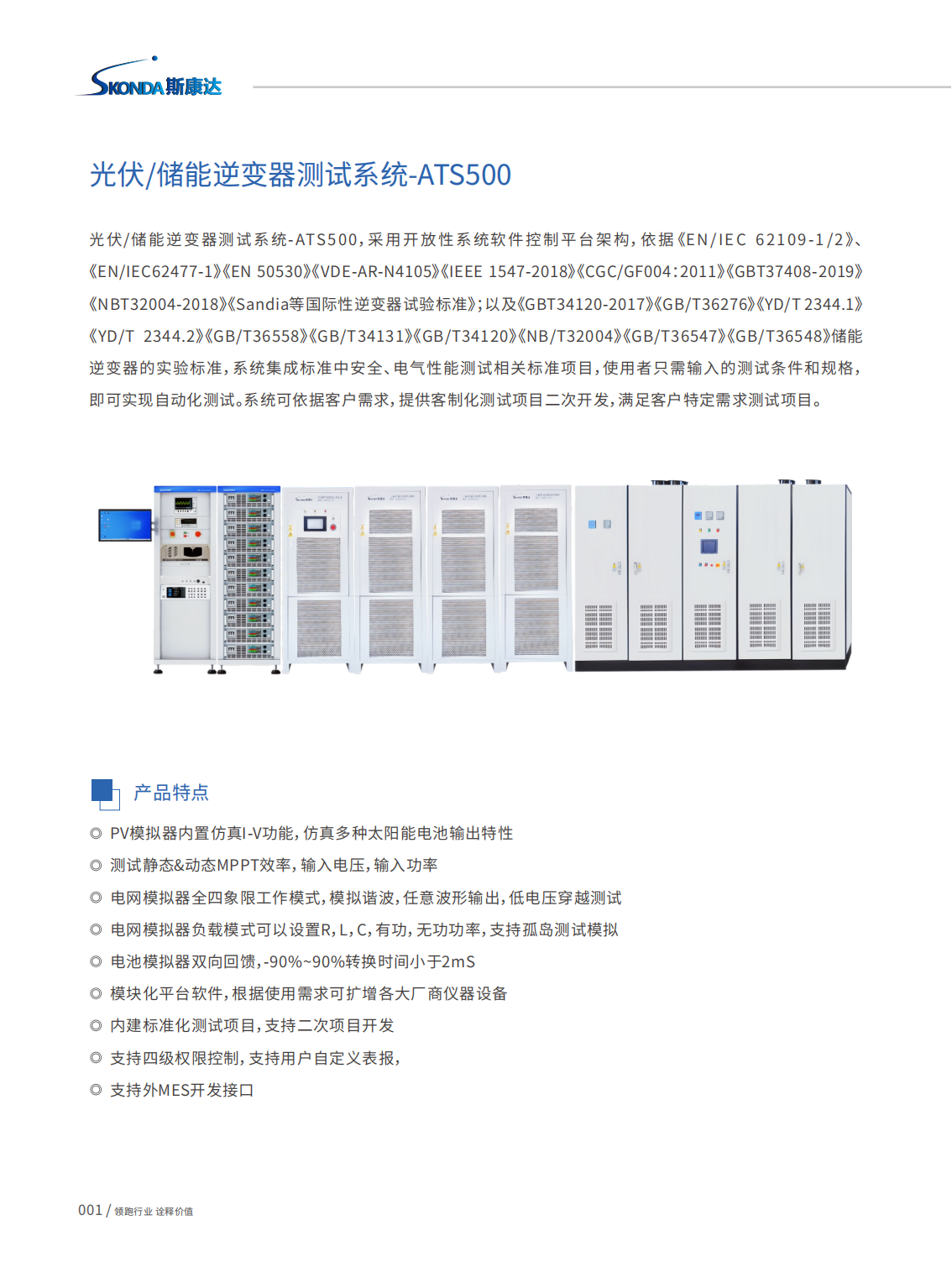 光伏/储能逆变器测试系统-ATS500,采用开放性系统软件控制平台架构,依据《EN/IEC 62109-1 /2》、《EN/IEC62477-1》《EN50530》《VDE-AR-N4105》《IEEE1547-2018》《CGC/GF004:2011》《GBT37408-2019》《NBT32004-2018》《Sandia等国际性逆变器试验标准》;以及《GBT34120-2017》《GB/T36276》《YD/T2344.1》《YD/T 2344.2》《GB/T36558》《GB/T34131》《GB/T34120》《NB/T32004》《GB/T36547》《GB/T36548》储能逆变器的实验标准,系统集成标准中安全、电气性能测试相关标准项目,使用者只需输入的测试条件和规格,即可实现自动化测试。系统可依据客户需求,提供客制化测试项目二次开发,满足客户特定需求测试项目。