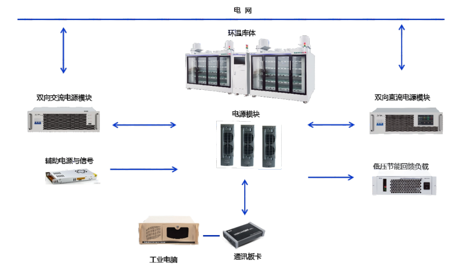 通用电源层板式环温老化BTS310,集成超高回馈效率的高压回馈负载、低压回馈负载、交流回馈负载,大大减少老化能耗,节约老化成本。支持双向电源模块源载一体模式支持单向和双向老化模式,配置独立通讯功能模块,支持一对一通讯控制,真实还原实际工作场景老化。支持环境温度、冷媒温度、冷媒流量、冷媒压力等参数客户自定义,满足不同用户老化需求,覆盖范围广。老化系统支持数据一对一读取和保存,标准化MES功能对接模块,数据可溯源。应用于电源产品研发耐久、生产老化测试。