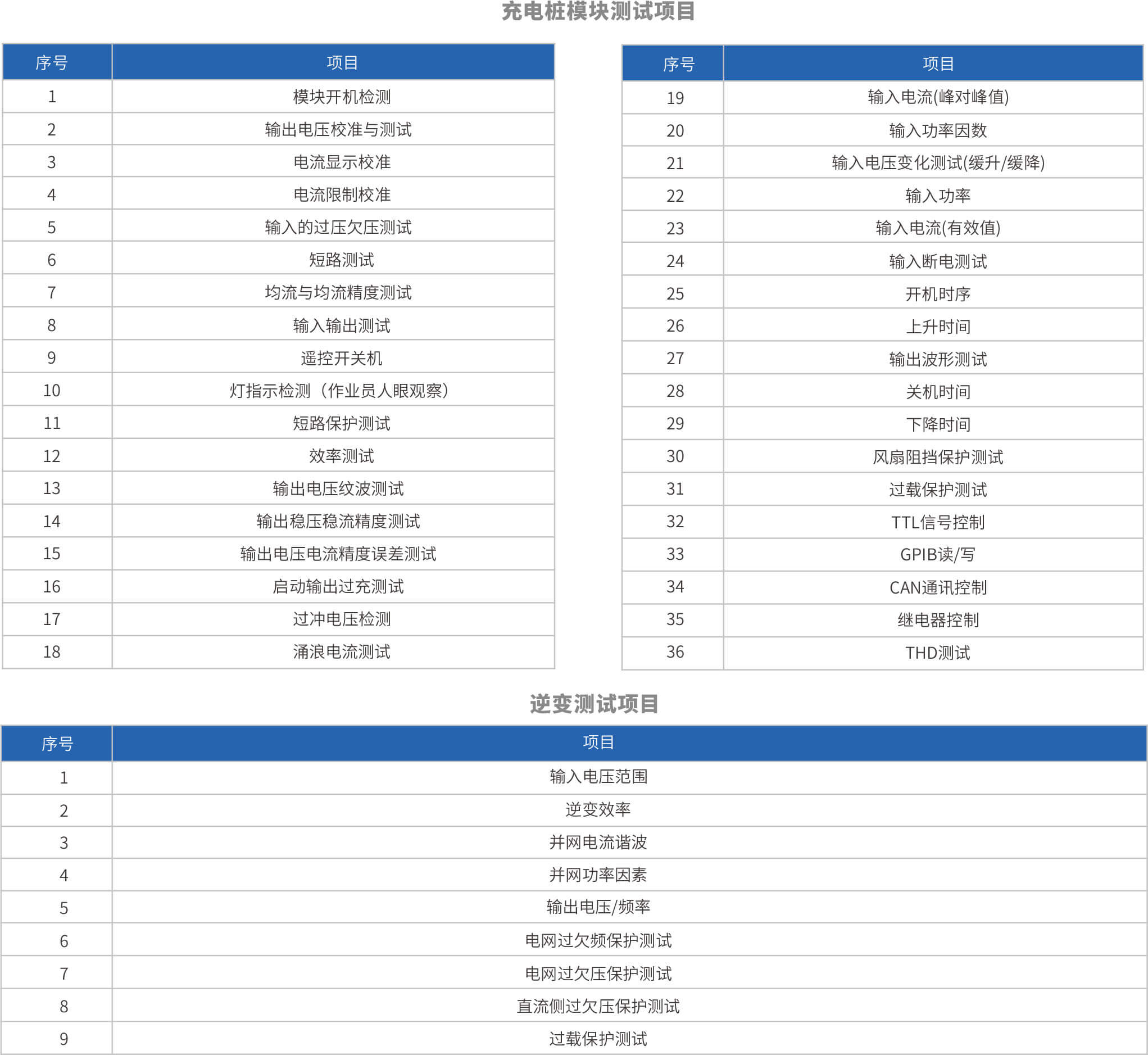 • 功能涵盖:输入特性测试,输出特性测试,控制精度测试,电压电流精度校准,保护功能测试,通讯功能测试,扩展通讯功能测试;