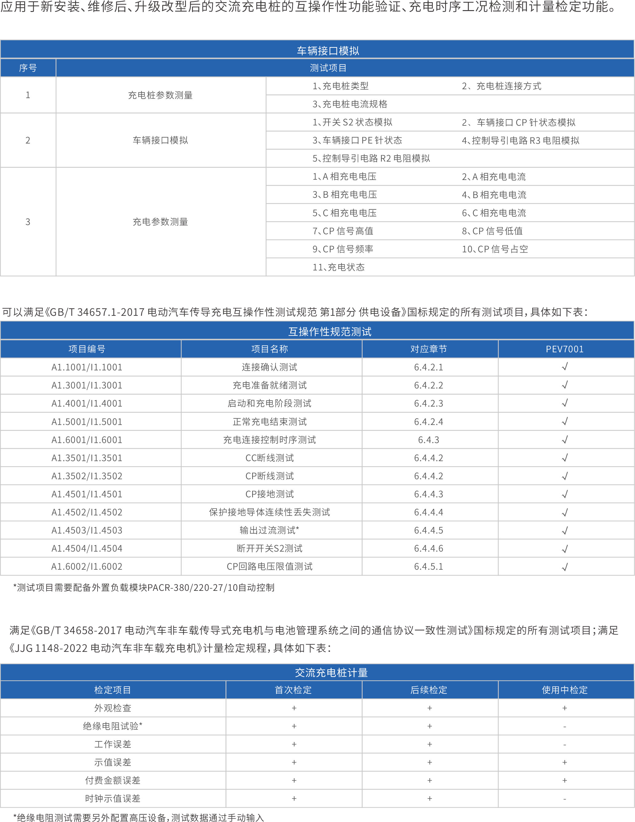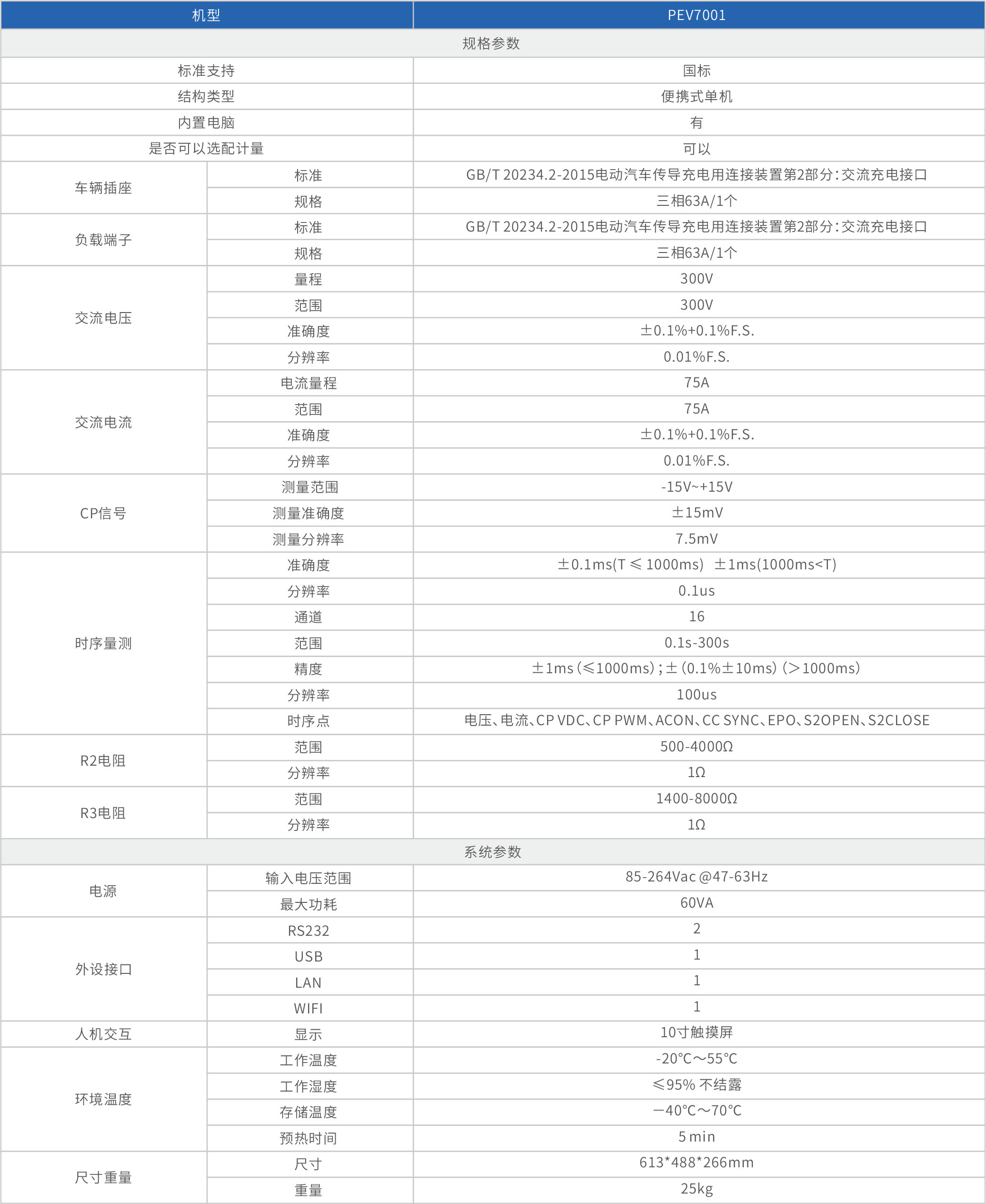 便携式交流充电桩测试计量综合仪PEV7001,具有互操作性测试以及计量检定功能测试。具有精度高、体积小、重量轻,便于携带等特点,可满足实验室及现场等多种场合计量检测与性能测试。分析仪具有计量模块,满足《JJG 1148-2022 电动汽车交流充电桩》计量检定规程,可检定电压误差、电流误差、功率误差、工作误差、示值误差、付费金额误差、时钟示值误差。内置软件功能模块,可实现《GB/T34657.1-2017 电动汽车传导充电互操作性测试规范第1部分供电设备》测试项目。带有2个63A标准充电枪插座,引脚定义满足GB/T 20234.2-2015中规定要求。