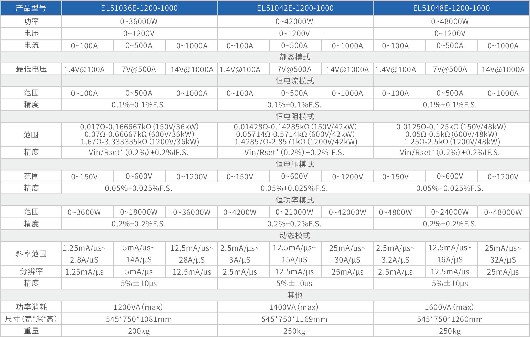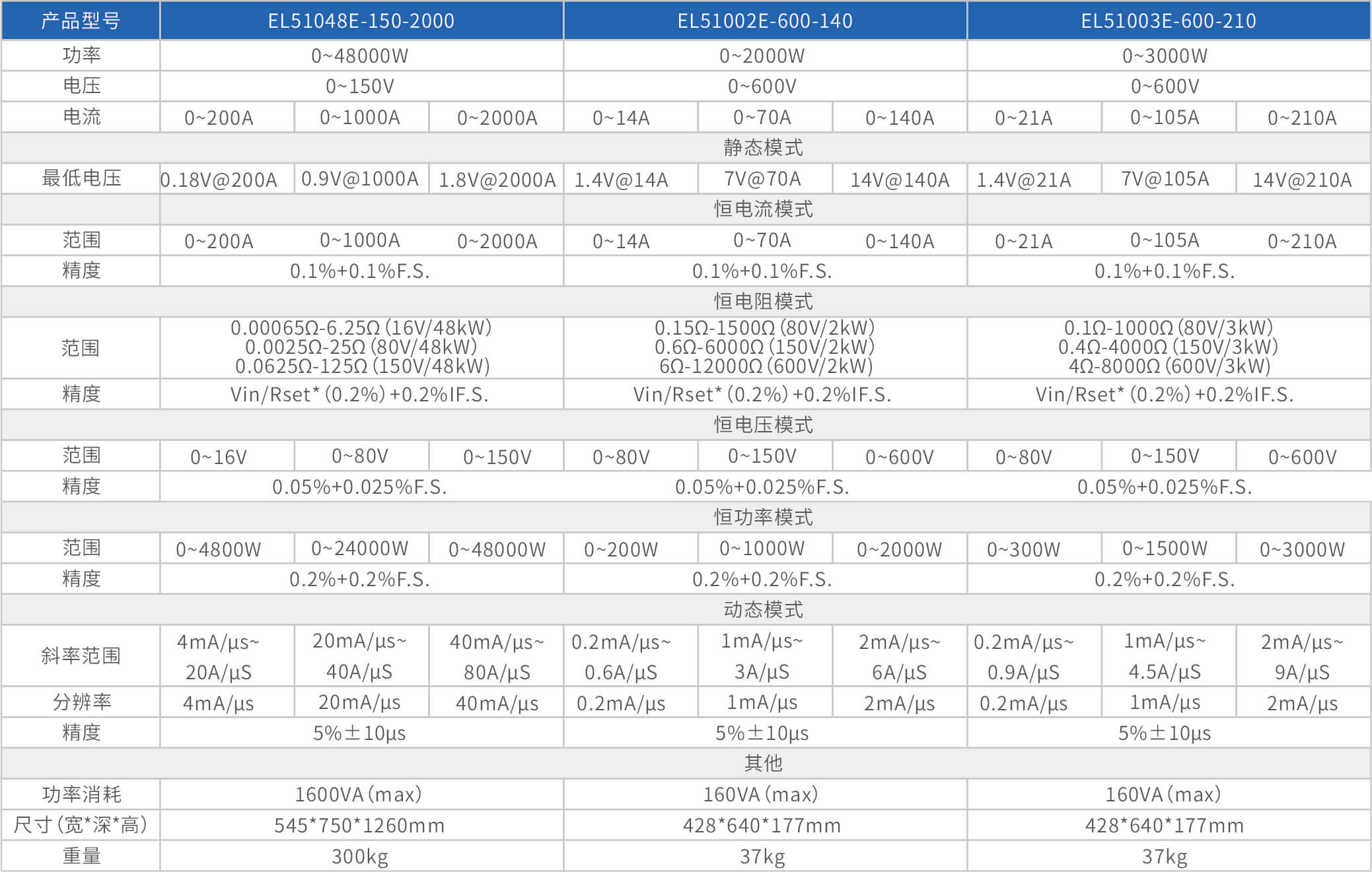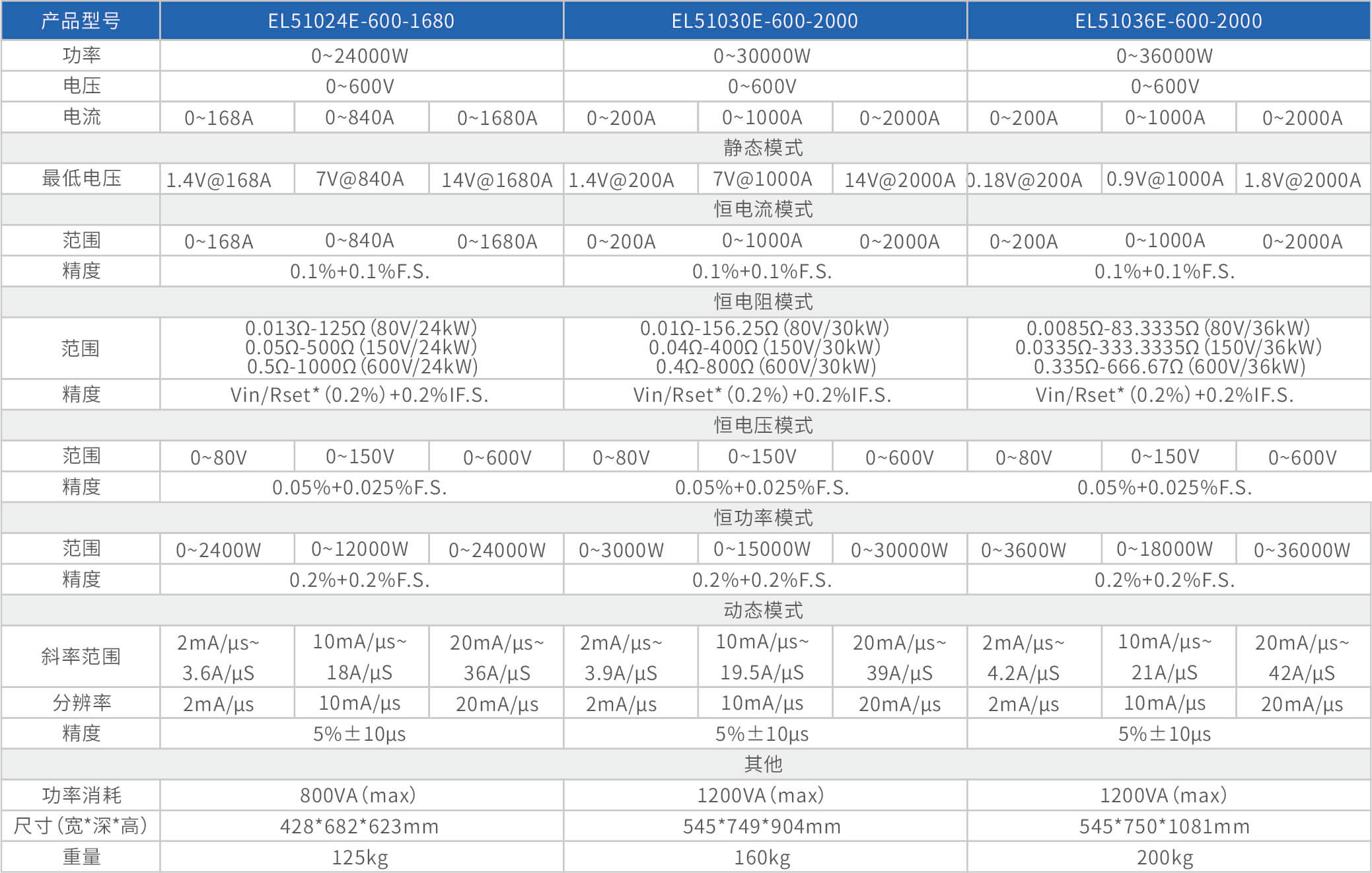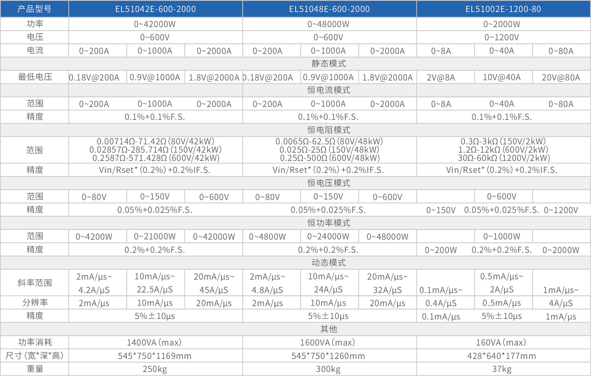 大功率电子负载EL51000E系列,有150V、600V、1200V三种电压范围,功率范围由2kW至48kW,单一台的最大电流可达2000A;通过并联扩展,最大功率更可达480kW。EL51000A系列负载具有高功率密度、高控制和测量精度、高性价的特点;同时本系列负载具备同步动态,并联扩展等功能,以及瞬间提供三倍额定功率功能,支持恒电压CV、恒电流CC、恒电阻CR、恒功率CP四种传统静态加载模式,以及CV+CC、CR+CC、CV+CR三种复合加载模式。
