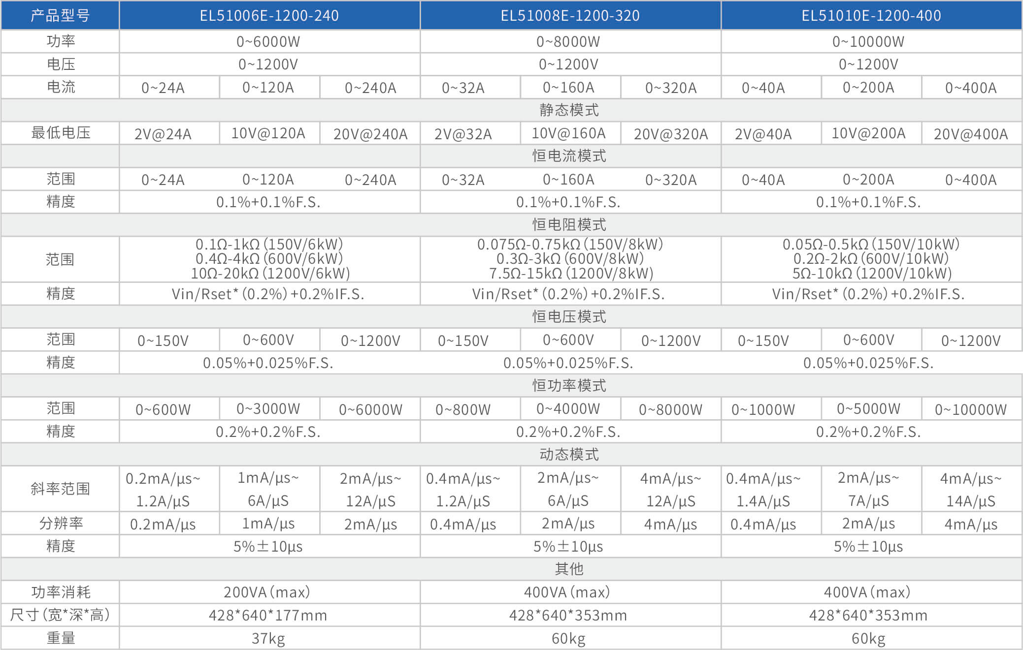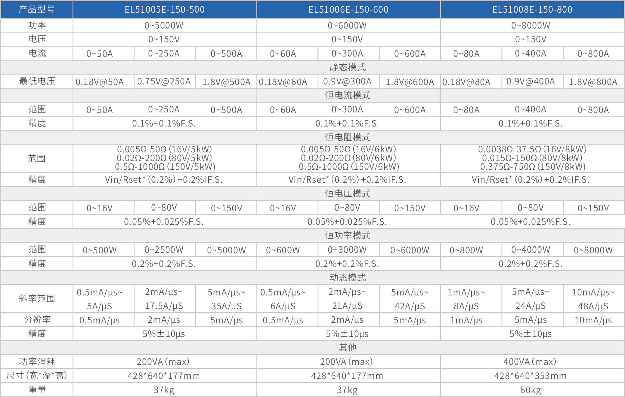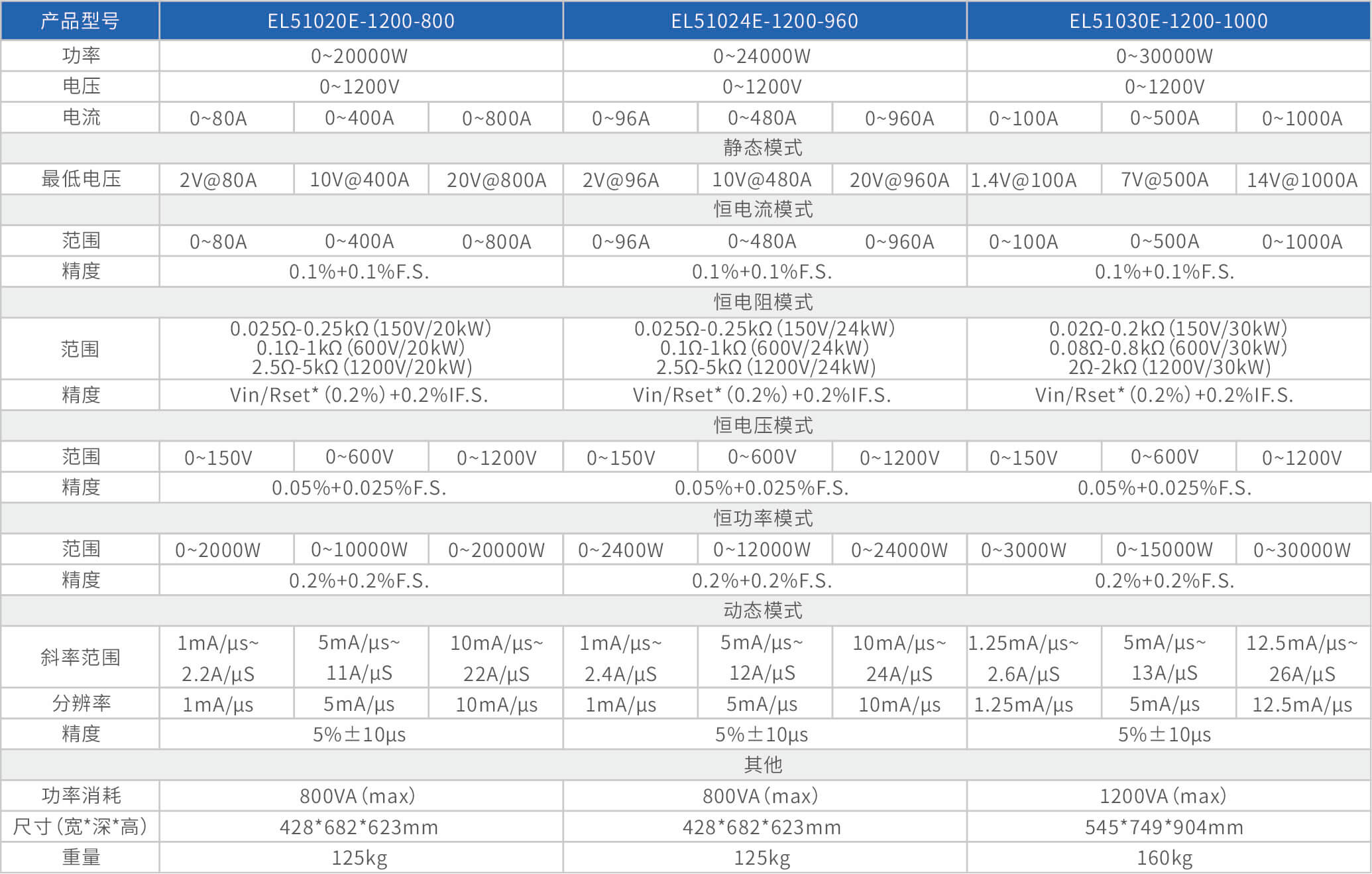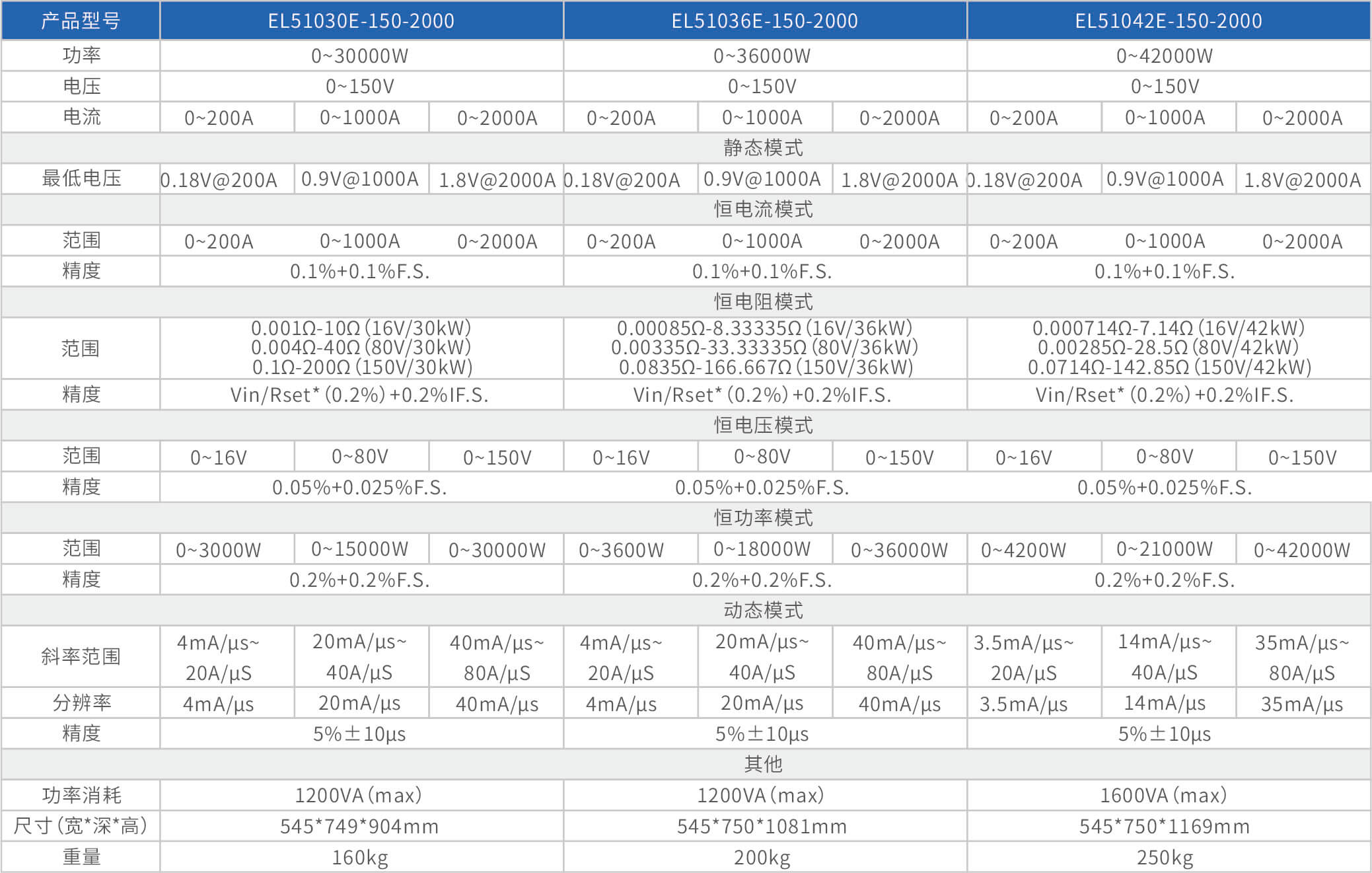 大功率电子负载EL51000E系列,有150V、600V、1200V三种电压范围,功率范围由2kW至48kW,单一台的最大电流可达2000A;通过并联扩展,最大功率更可达480kW。EL51000A系列负载具有高功率密度、高控制和测量精度、高性价的特点;同时本系列负载具备同步动态,并联扩展等功能,以及瞬间提供三倍额定功率功能,支持恒电压CV、恒电流CC、恒电阻CR、恒功率CP四种传统静态加载模式,以及CV+CC、CR+CC、CV+CR三种复合加载模式。