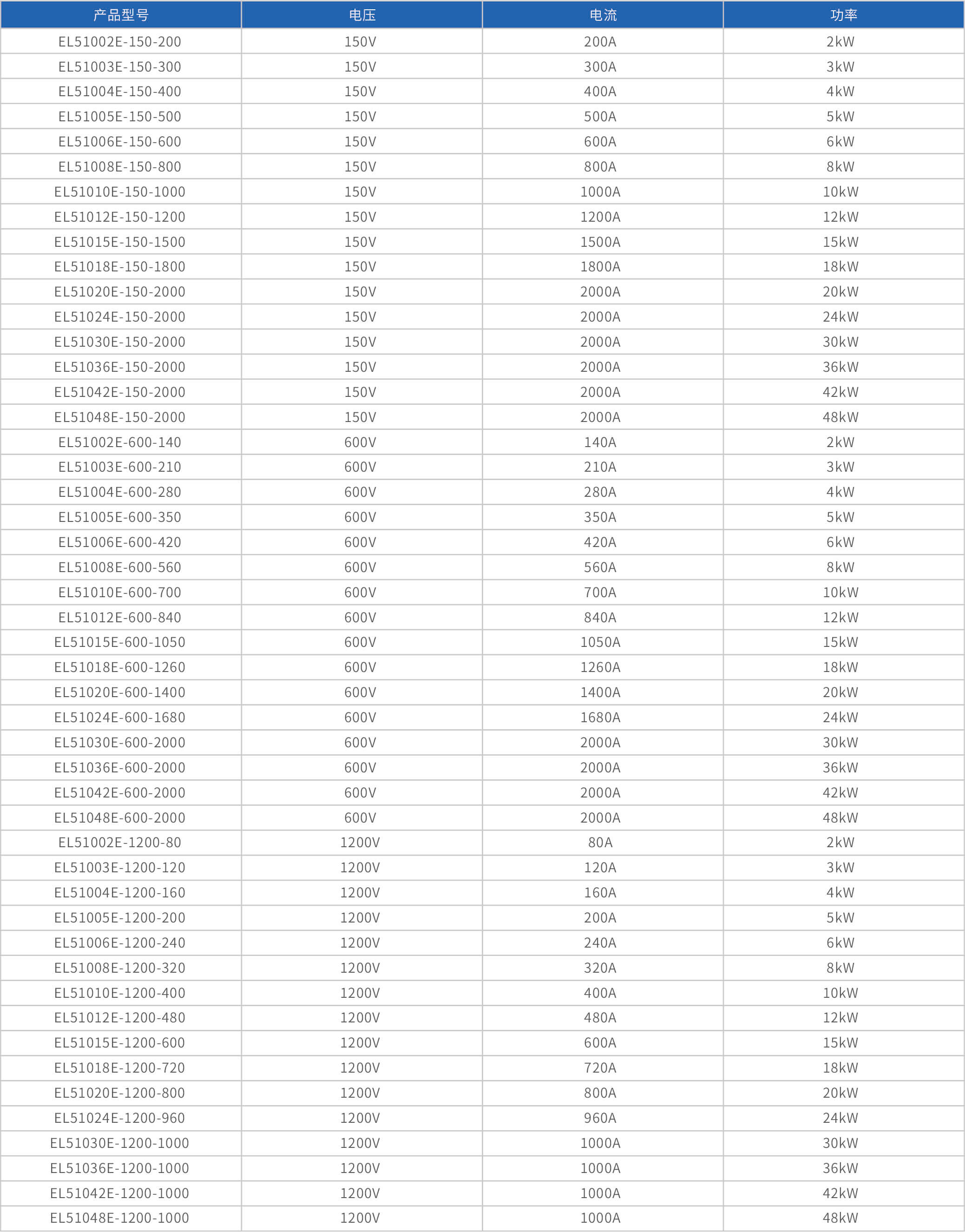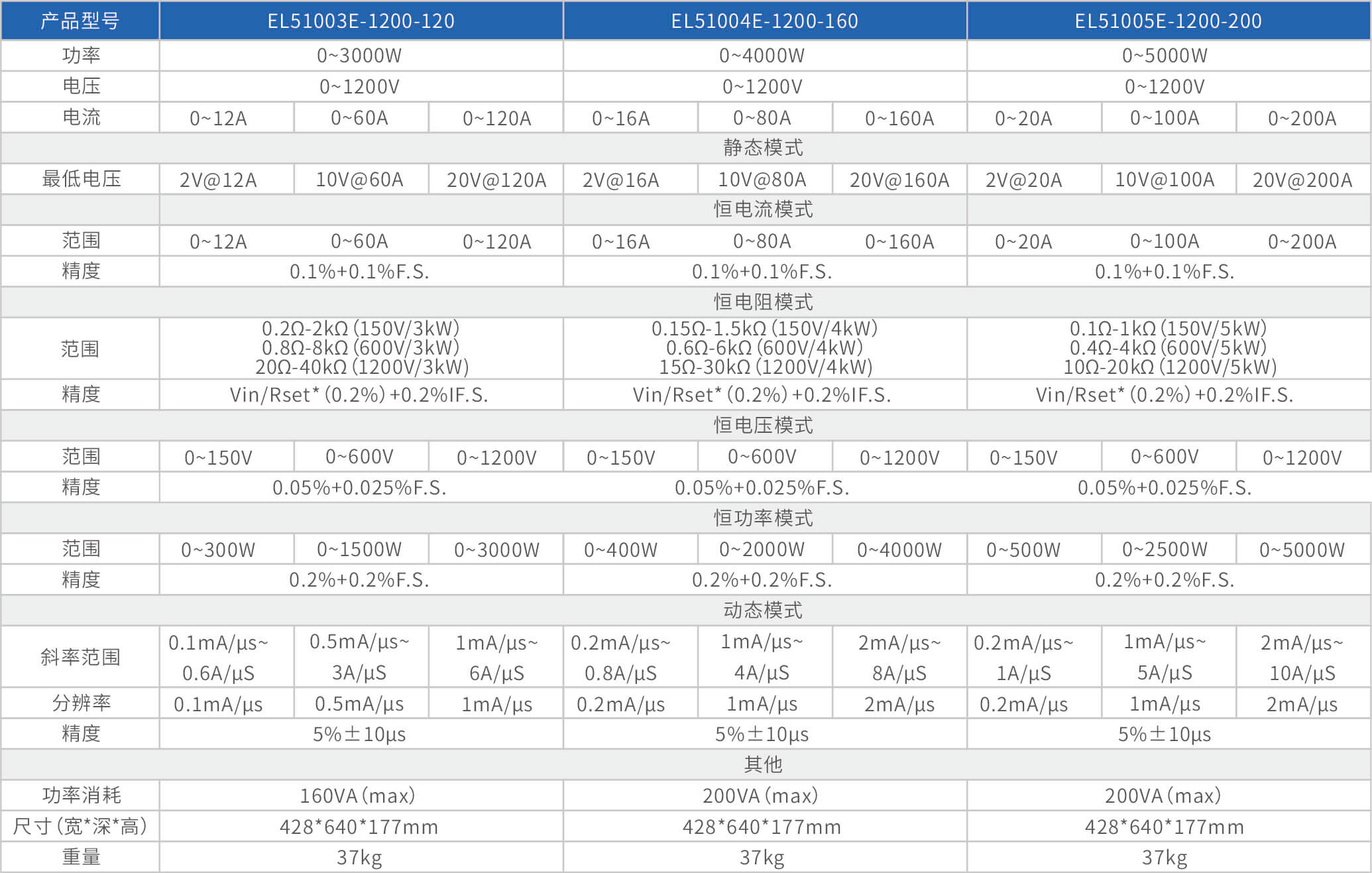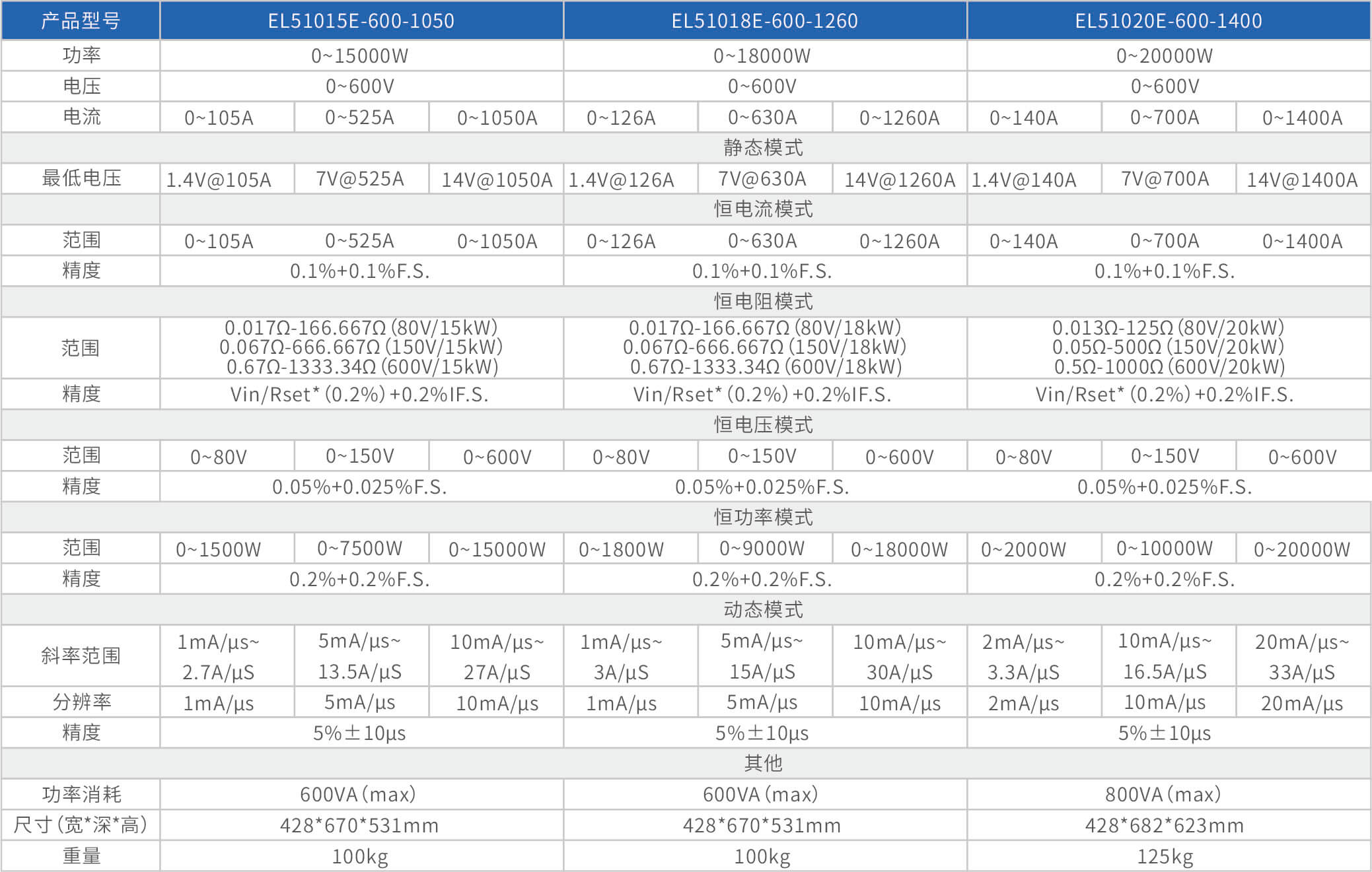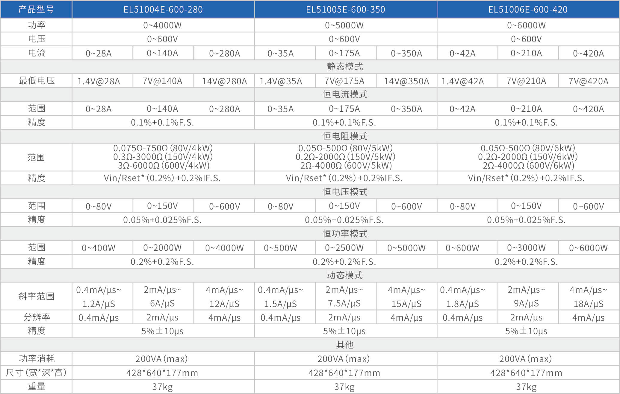 大功率电子负载EL51000E系列,有150V、600V、1200V三种电压范围,功率范围由2kW至48kW,单一台的最大电流可达2000A;通过并联扩展,最大功率更可达480kW。EL51000A系列负载具有高功率密度、高控制和测量精度、高性价的特点;同时本系列负载具备同步动态,并联扩展等功能,以及瞬间提供三倍额定功率功能,支持恒电压CV、恒电流CC、恒电阻CR、恒功率CP四种传统静态加载模式,以及CV+CC、CR+CC、CV+CR三种复合加载模式。