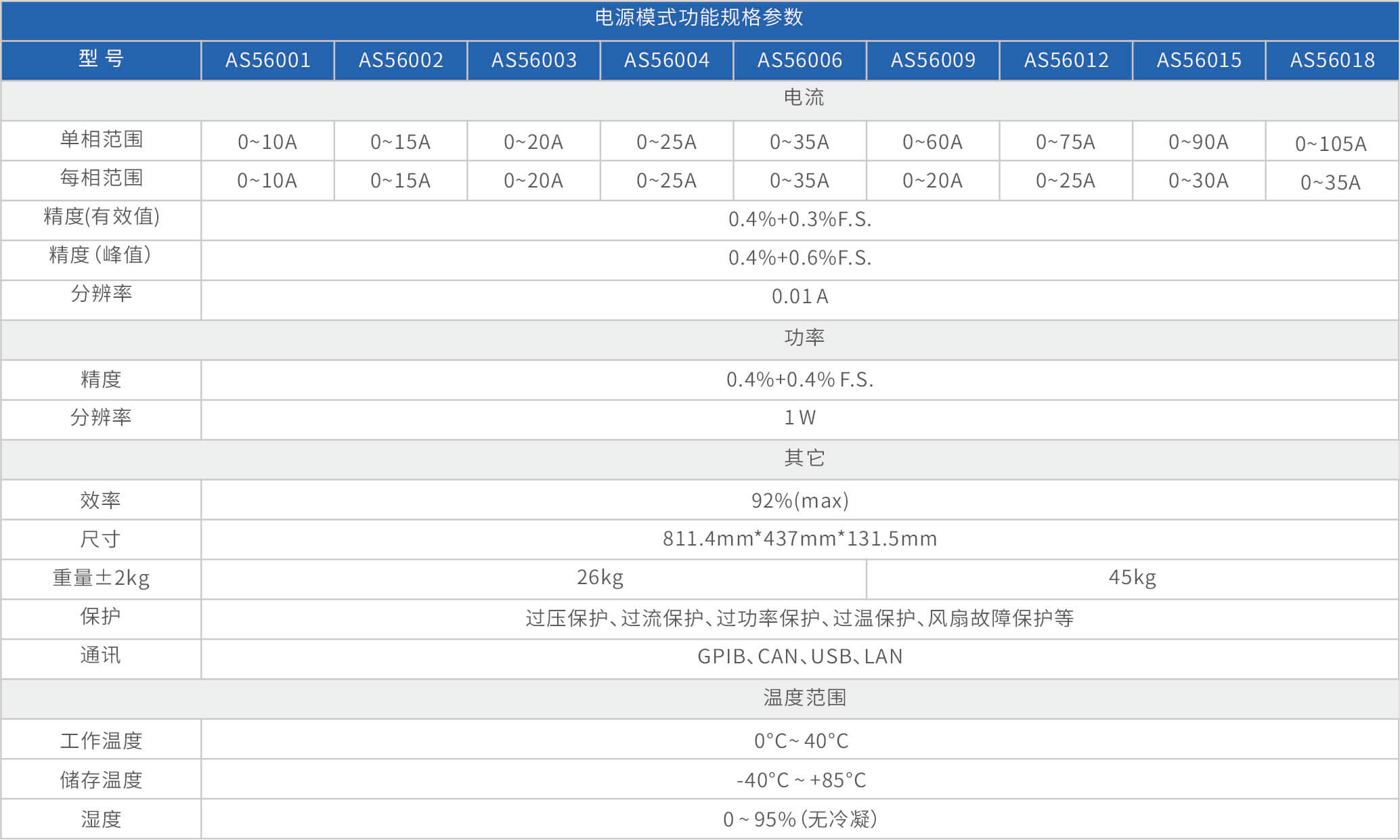 AS56000系列双向交流电源是⼀款高功率密度、高精度、高性能的产品,可作为稳定的供电电源,亦可作为回馈式负载,将电能无污染地回馈至电网,实现低能耗和高转换效率,节省用电成本。
