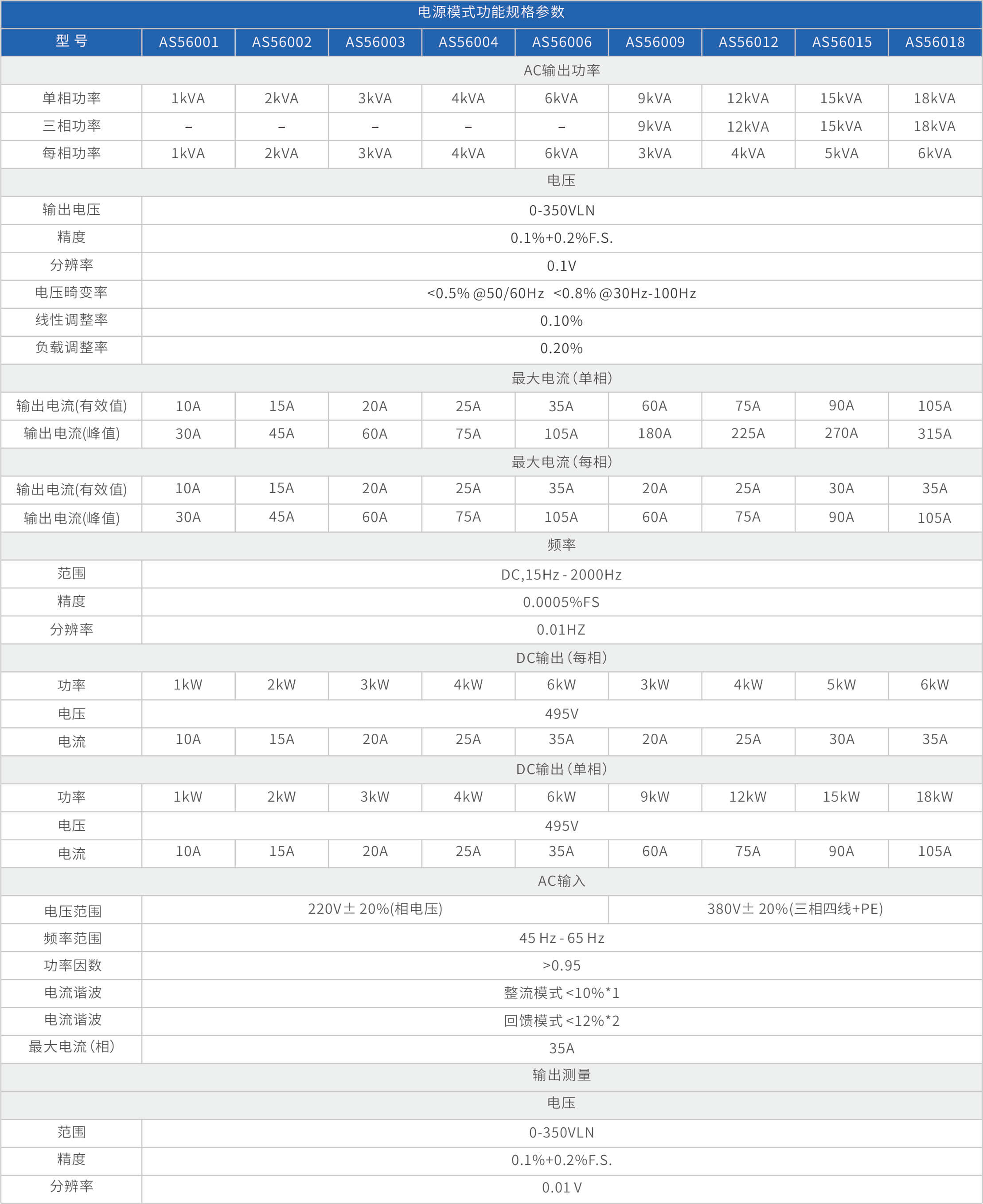AS56000系列交流电源可选择多种控制方式,支持数字RS232/LAN/GPIB/CAN通讯接口,内置波形编缉功能,灵活的单/三相操作模式,是一款功能丰富、性能优异、适用广泛的交流电源。