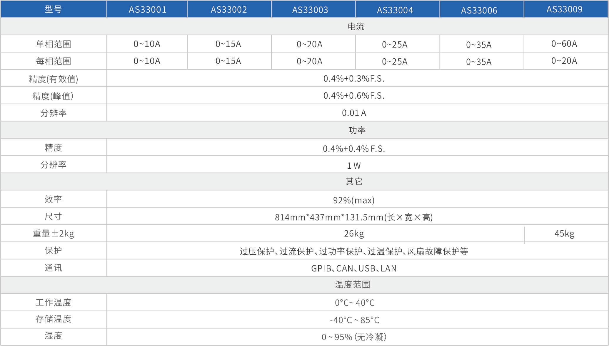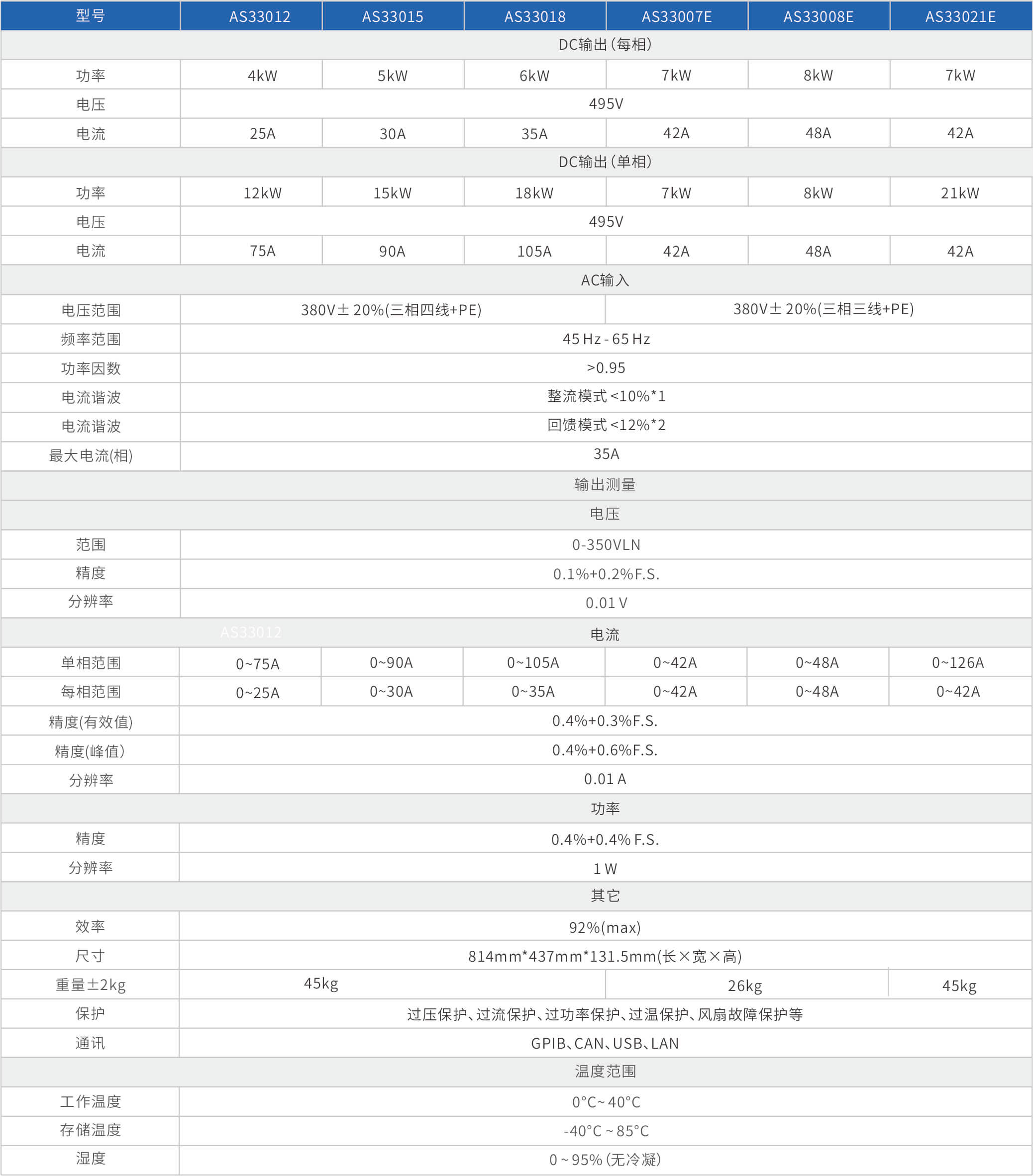 AS33000系列交流电源是一款高功率密度、高精度、高性能的产品,可作为稳定的供电电源。可选择多种控制方式,支持数字RS232/LAN/GPIB/CAN 通讯接口,内置波形编缉功能,灵活的单/三相操作模式,是一款功能丰富、性能优异、适用广泛的交流电源。