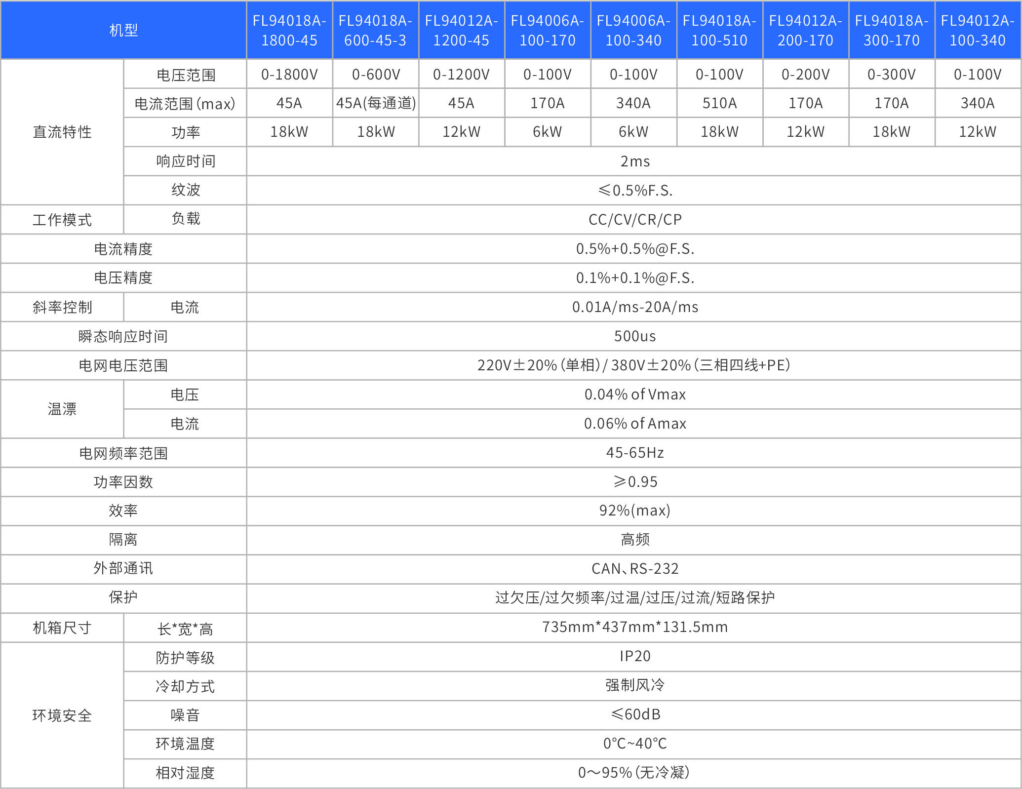 FL94000A系列为双向直流电源,即能作为直流源使用,又能够模拟多种负载将电能回馈至电网,降低了功率转换的用电成本,适用于新能源的储能系统测试。