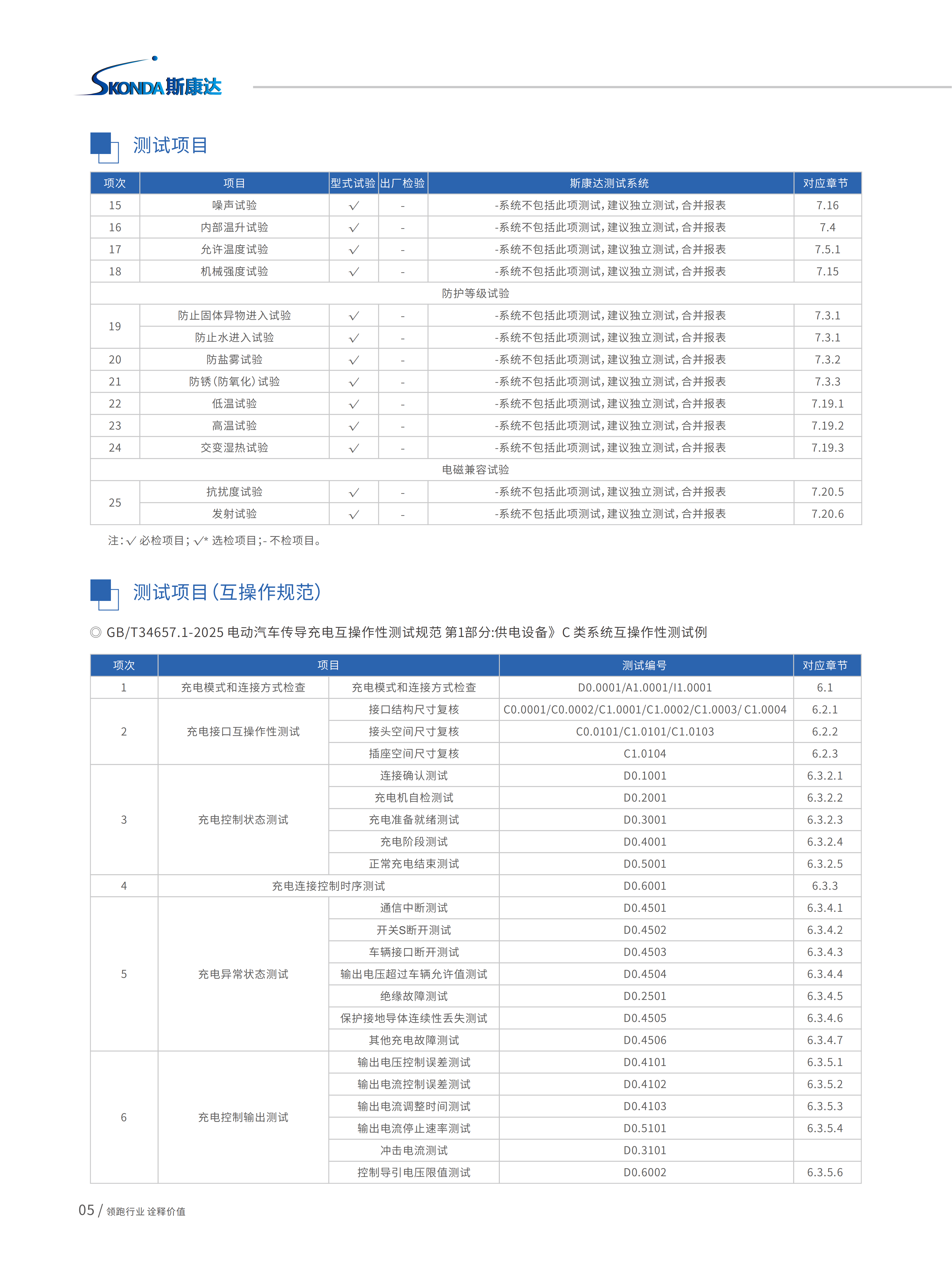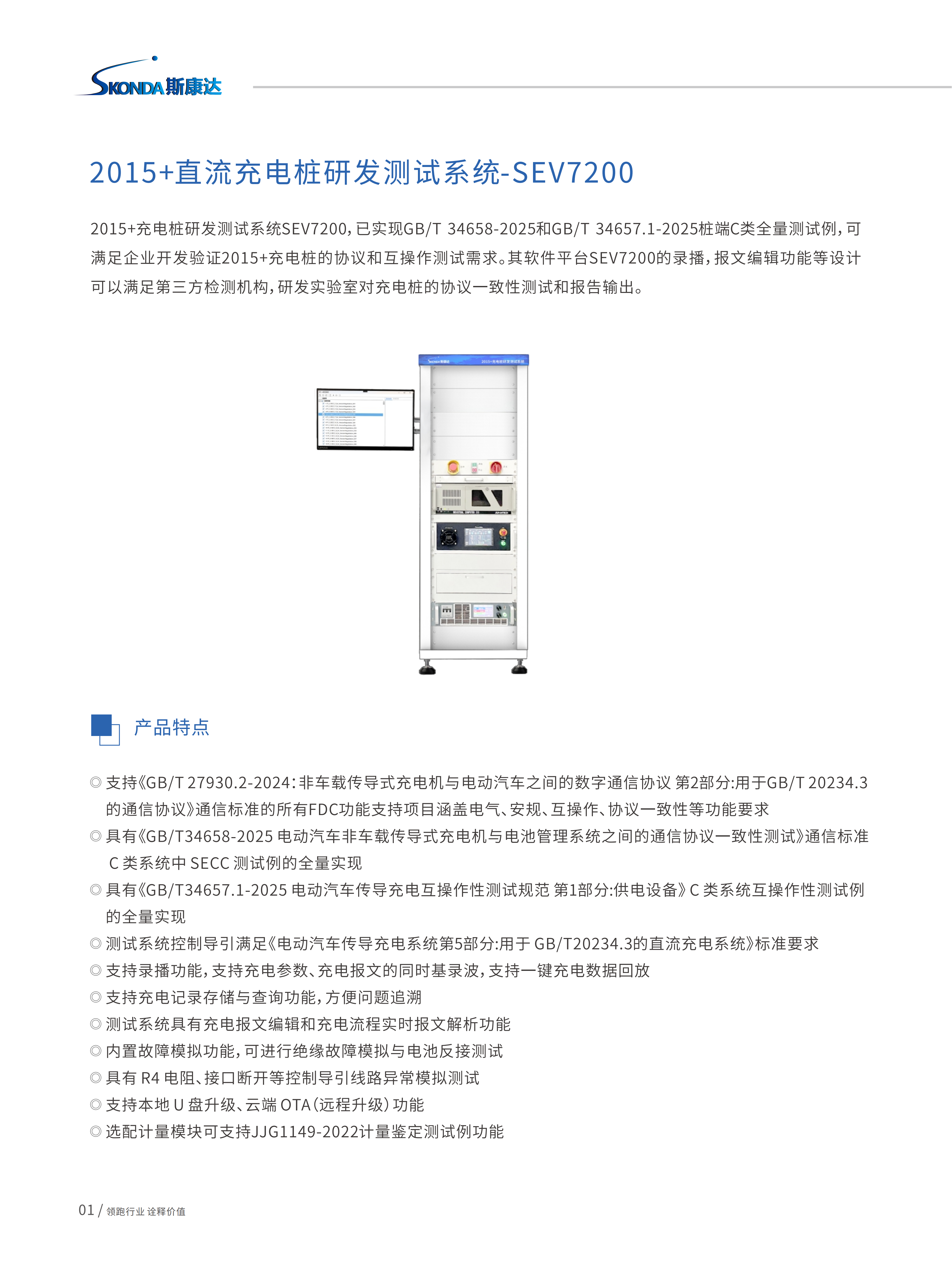- 2015+充电桩研发测试系统SEV7200,已实现GB/T 34658-2025和GB/T 34657.1-2025桩端C类全量测试例,可满⾜企业开发验证2015+充电桩的协议和互操作测试需求。其软件平台SEV7200的录播,报⽂编辑功能等设计可以满⾜第三⽅检测机构,研发实验室对充电桩的协议⼀致性测试和报告输出。