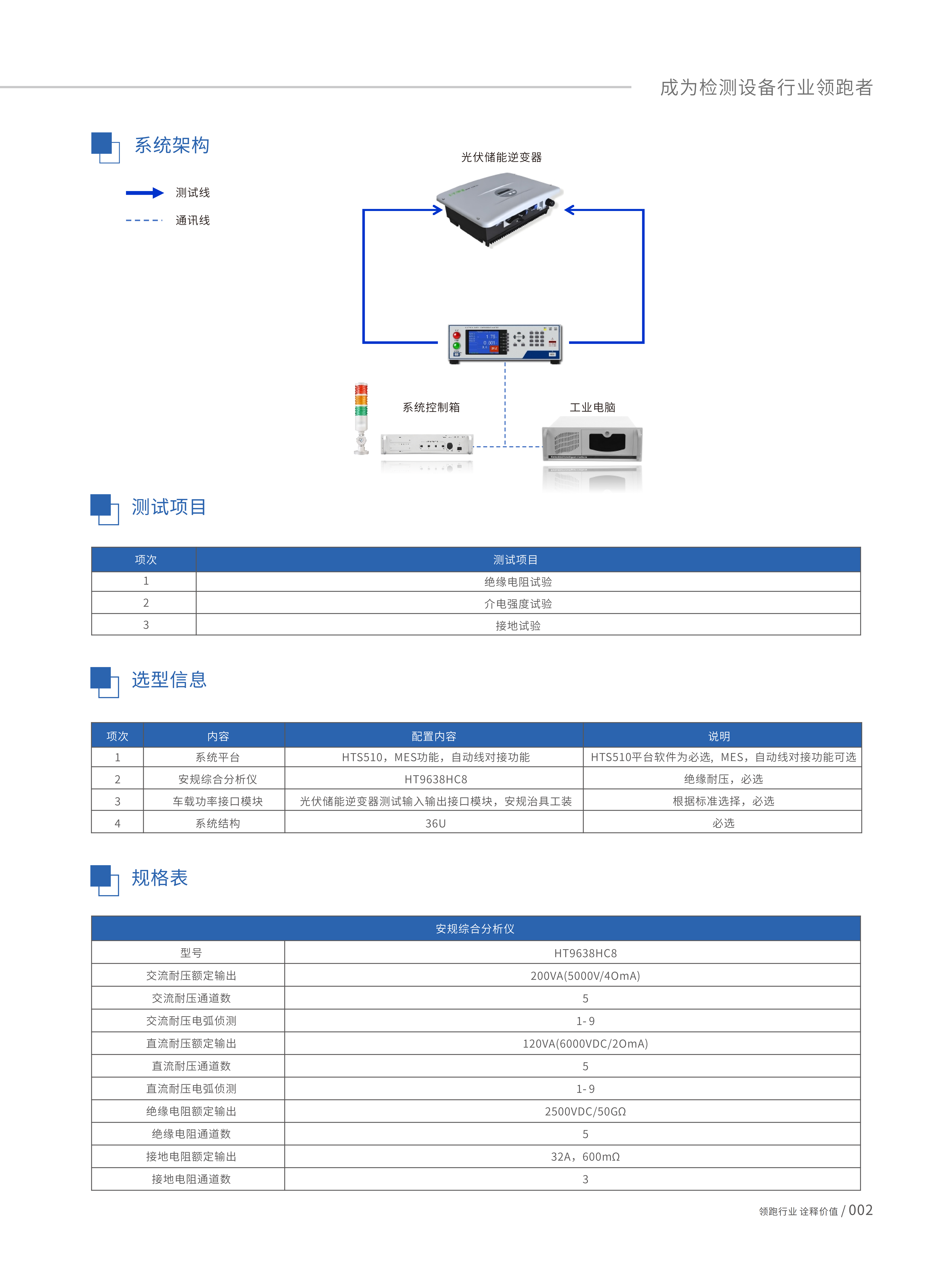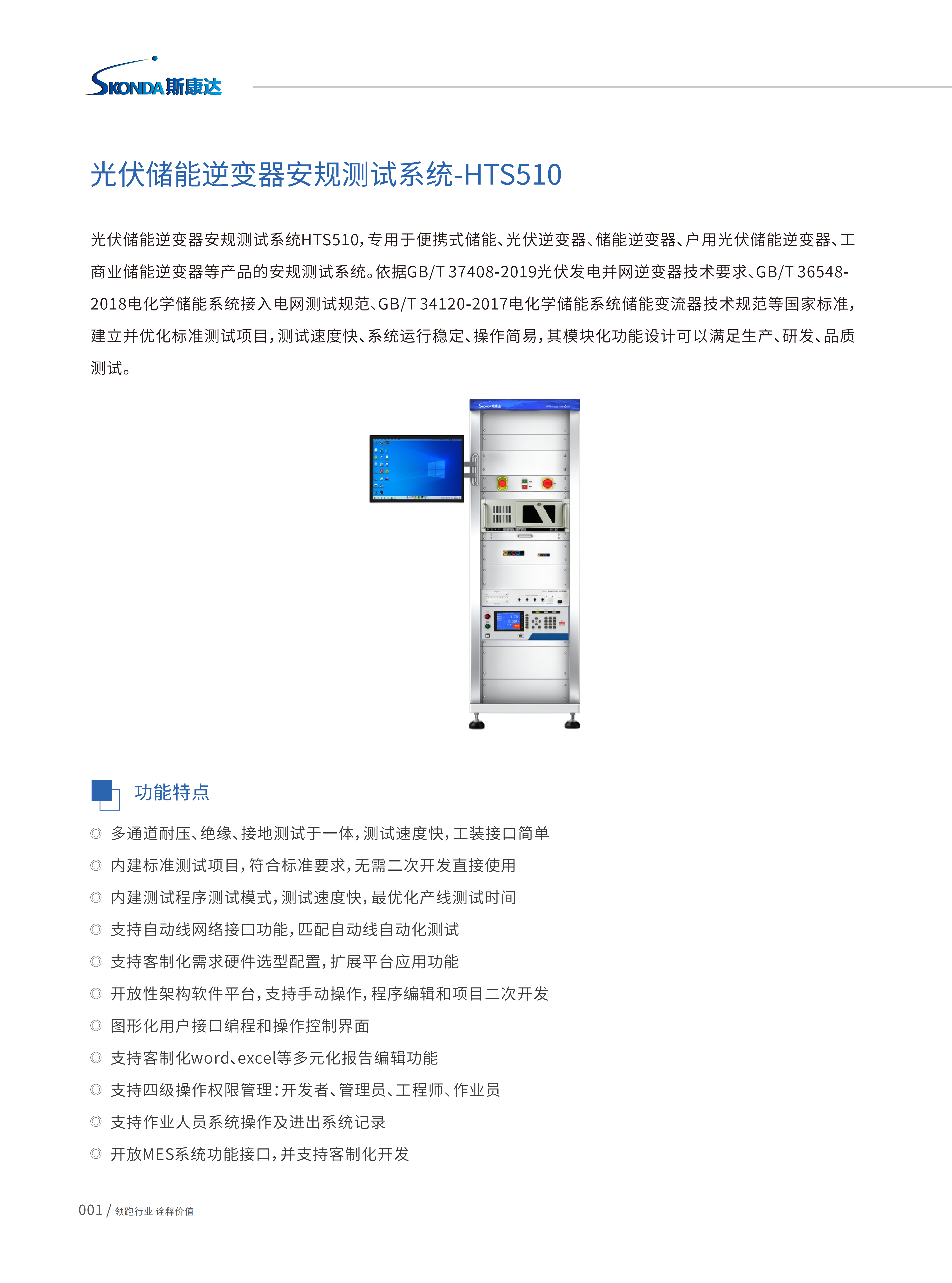 光伏储能逆变器安规测试系统HTS510,专⽤于便携式储能、光伏逆变器、储能逆变器、⼾⽤光伏储能逆变器、⼯ 商业储能逆变器等产品的安规测试系统。依据GB/T37408-2019光伏发电并⽹逆变器技术要求、GB/T36548- 2018电化学储能系统接⼊电⽹测试规范、GB/T34120-2017电化学储能系统储能变流器技术规范等国家标准, 建⽴并优化标准测试项⽬,测试速度快、系统运⾏稳定、操作简易,其模块化功能设计可以满⾜⽣产、研发、品质 测试。