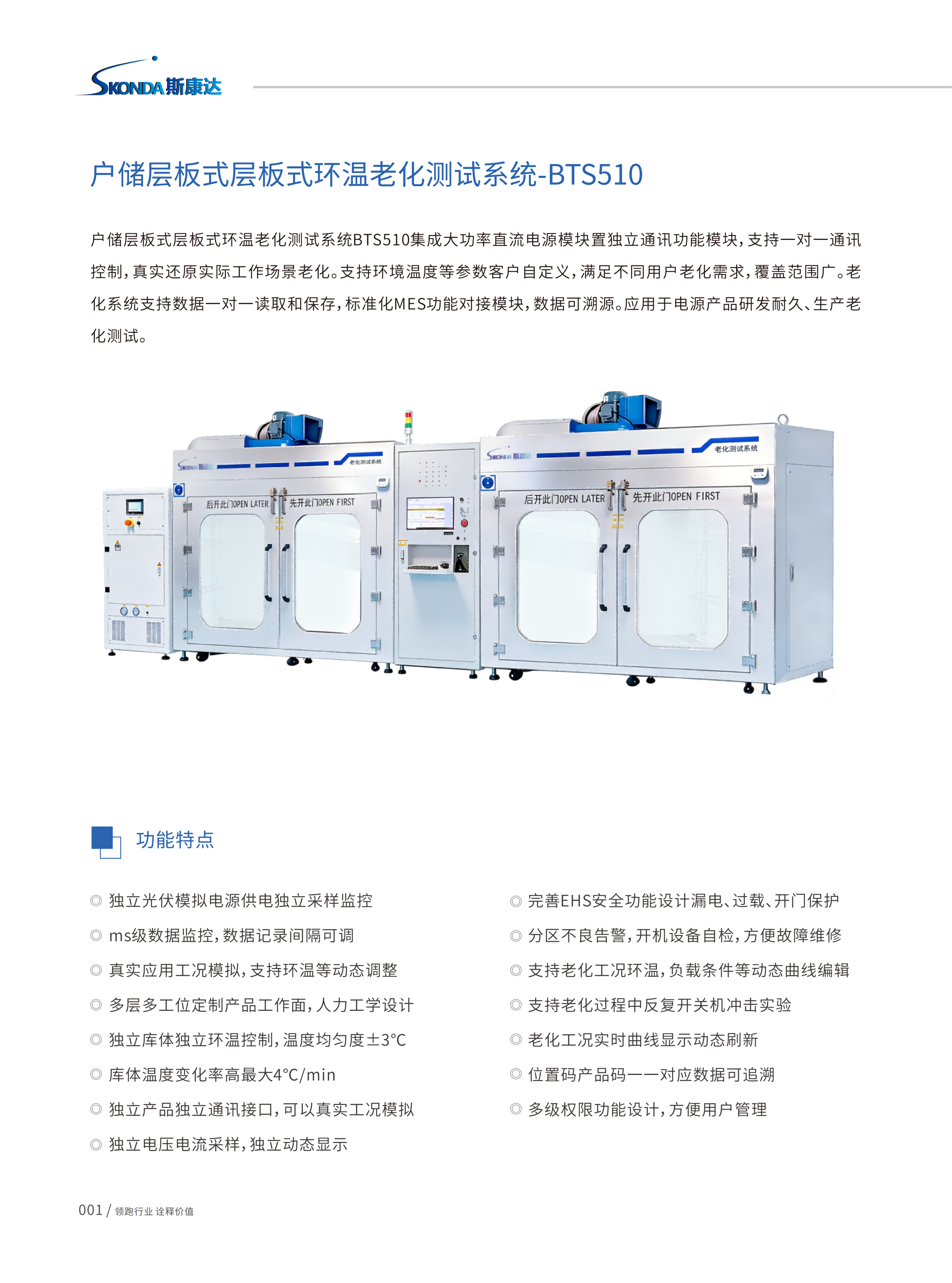 ⼾储层板式层板式环温⽼化测试系统BTS510集成⼤功率直流电源模块置独⽴通讯功能模块,⽀持⼀对⼀通讯 控制,真实还原实际⼯作场景⽼化。⽀持环境温度等参数客⼾⾃定义,满⾜不同⽤⼾⽼化需求,覆盖范围⼴。⽼ 化系统⽀持数据⼀对⼀读取和保存,标准化MES功能对接模块,数据可溯源。应⽤于电源产品研发耐久、⽣产⽼ 化测试。